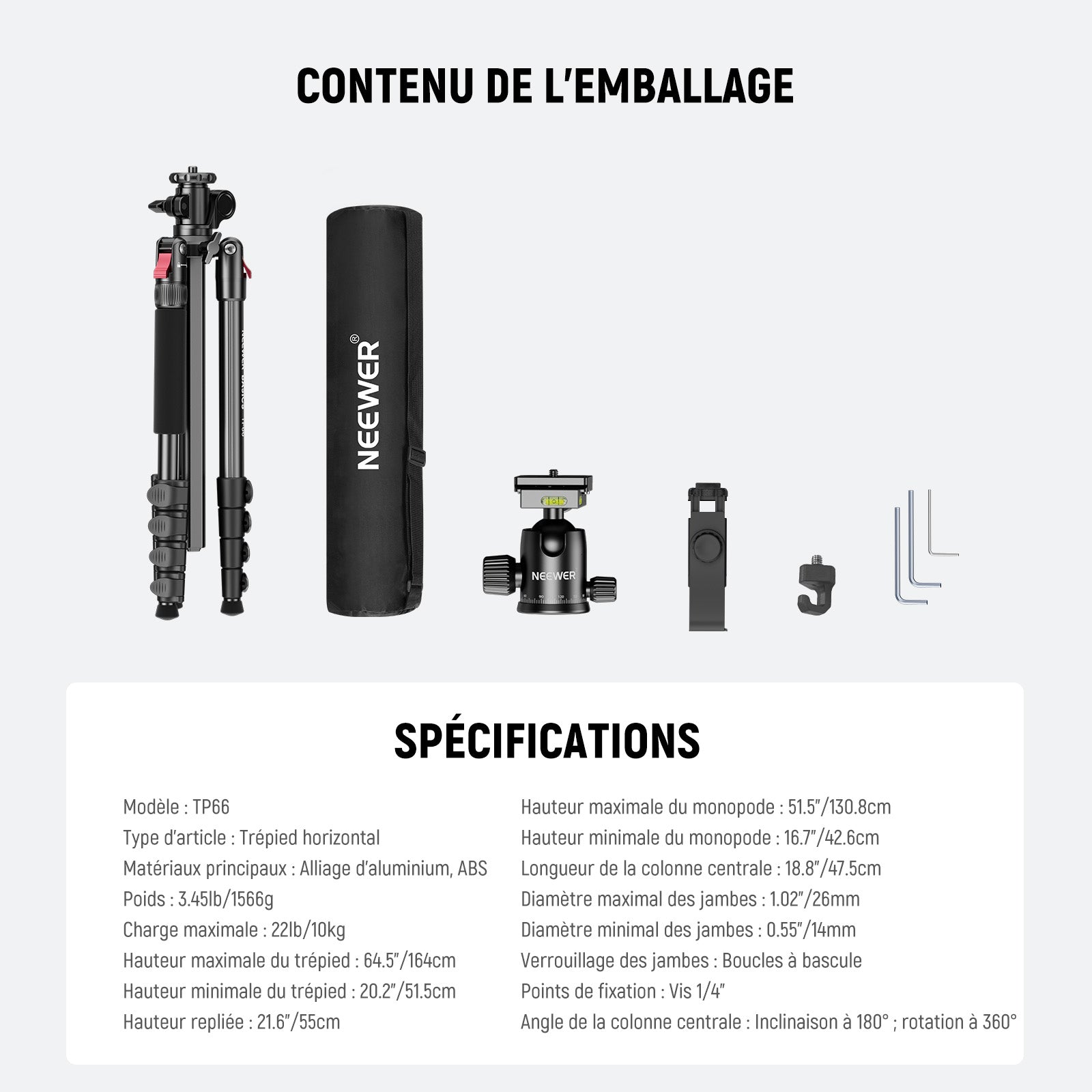 - 【Présentation de NEEWER BASICS】Simple et pratique, NEEWER BASICS est une gamme de produits qui se concentre sur les fonctions et les designs essentiels, sans extras ni matériaux inutiles. Le TP66 est un trépied horizontal portable mais puissant (51,5-164cm) conçu pour les configurations à double caméra. Il supporte jusqu'à 10kg d'engrenage et permet un panoramique 360° et une inclinaison 180°. Le trépied peut être converti en monopode (42,6 à 130,8cm) pour répondre à différents scénarios
