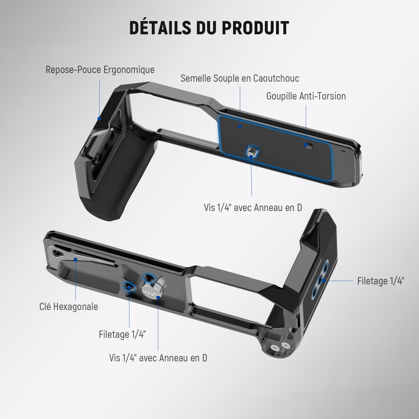 - 【Repose-Pouce Intégré & Poignée】 La plaque de montage possède un repose-pouce ergonomique pour améliorer la stabilité et le confort lorsque vous tenez l'appareil photo d'une seule main. De plus, la poignée est munie d'un revêtement antidérapant en caoutchouc pour éviter de glisser lors des prises de vue à main levée