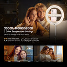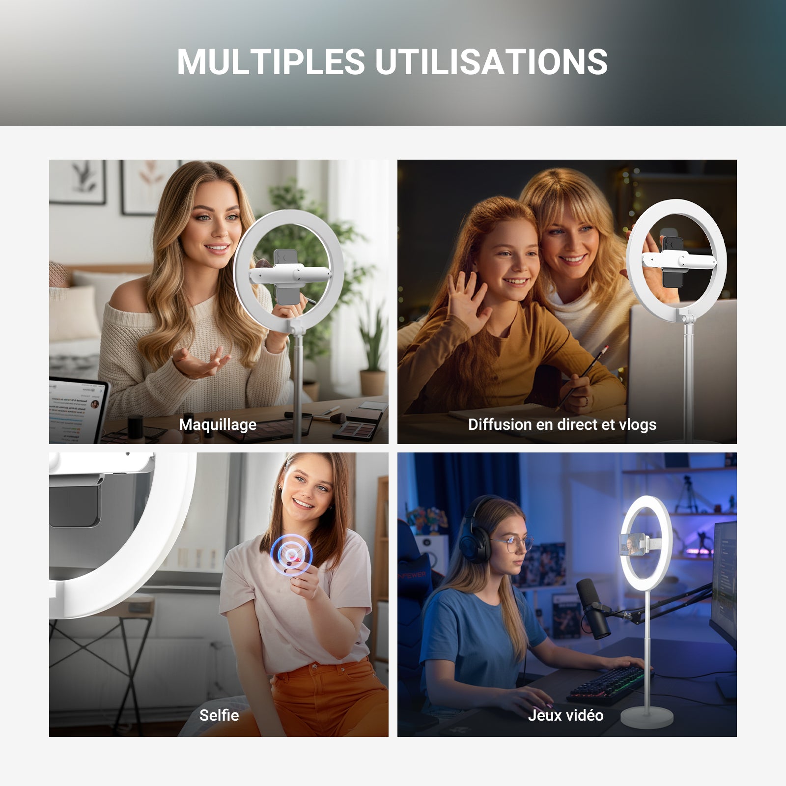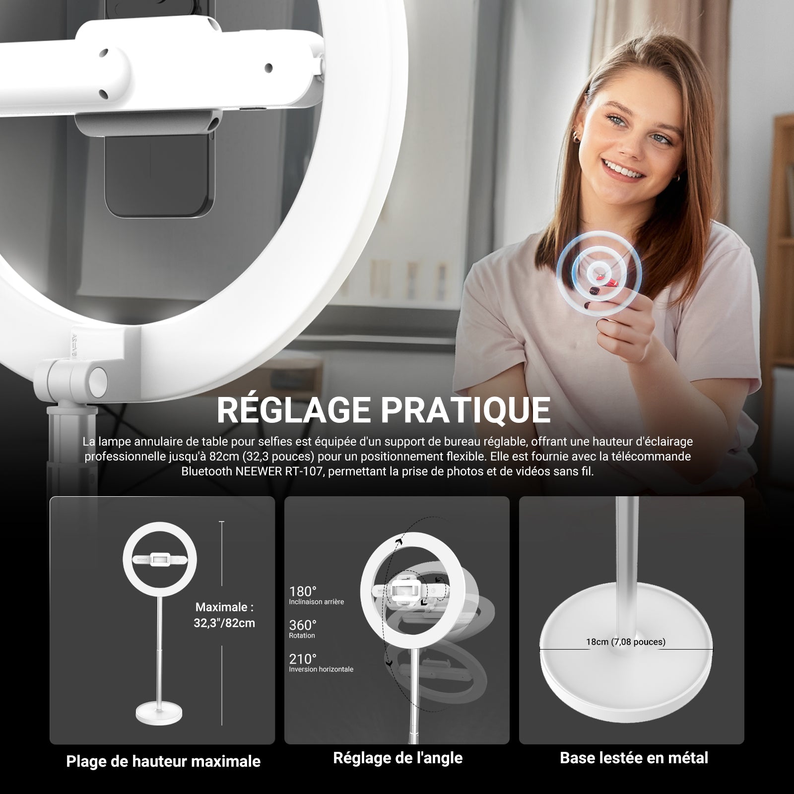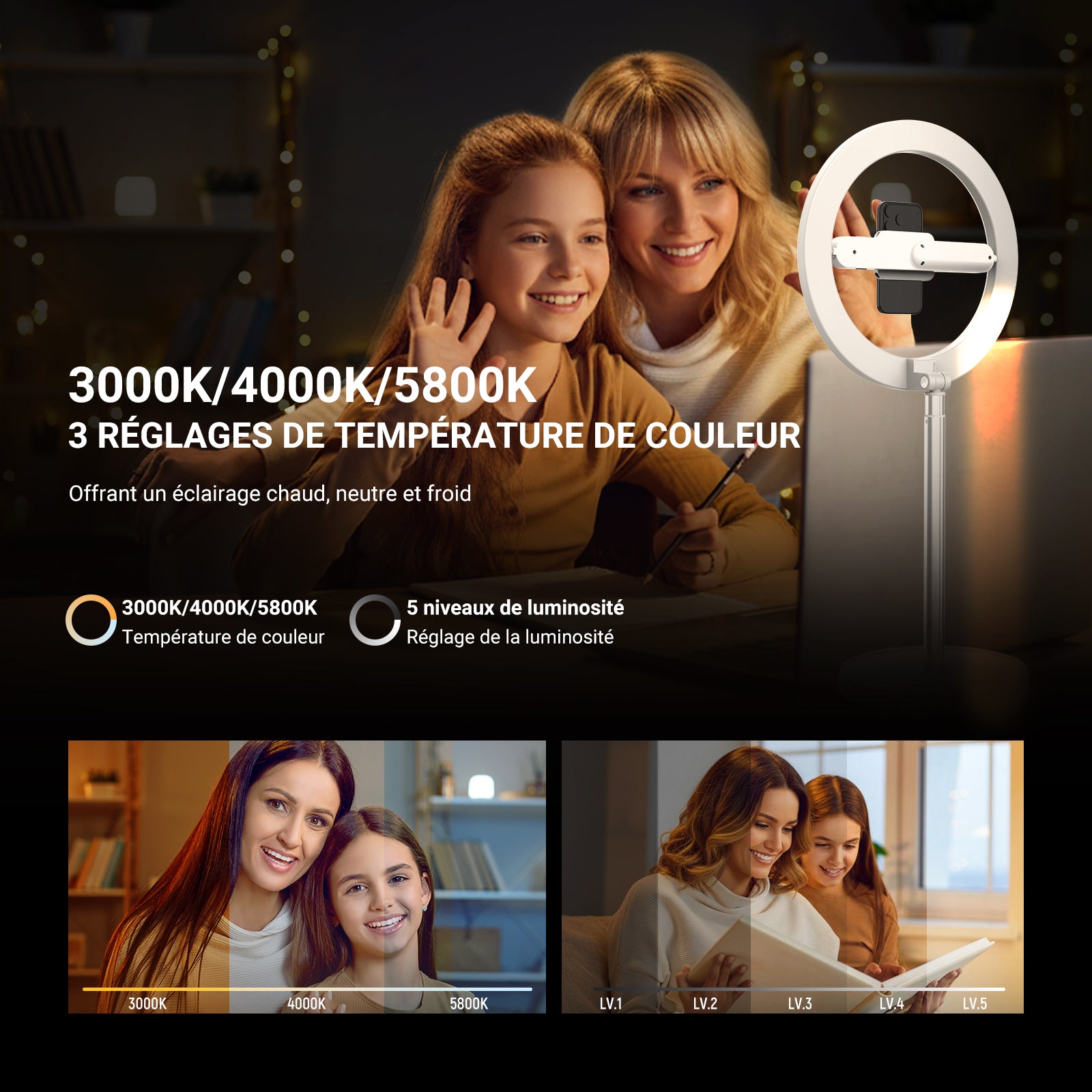 • 【3 modes de couleur et 5 niveaux de luminosité】 Dotée de 144 LED à lumière chaude et froide,cette lampe annulaire/ringlight offre une luminosité jusqu'à 830 lux à 0,5m avec CRI de 85+,proposant un éclairage chaud,neutre & froid avec 5 niveaux de luminosité pour sublimer différentes carnations.Éclairage doux et uniforme pour sublimer regard et atténuer ombre marquée.Idéal comme lumière principale ou d'appoint pour vidéos,maquillage,podcasts,diffusions en direct,photographie et vidéographie,selfie