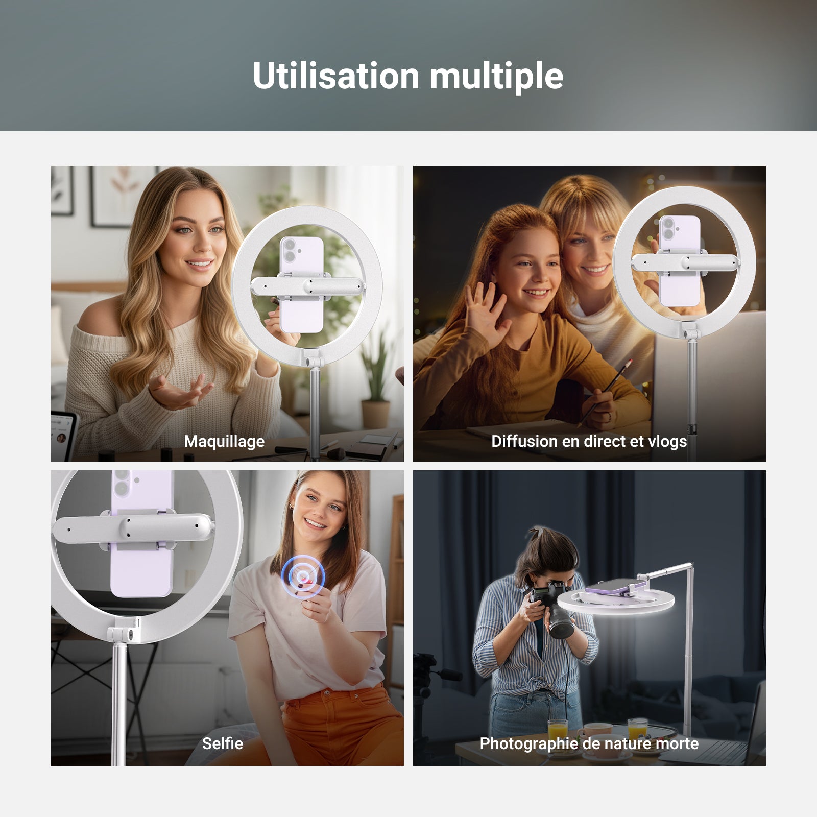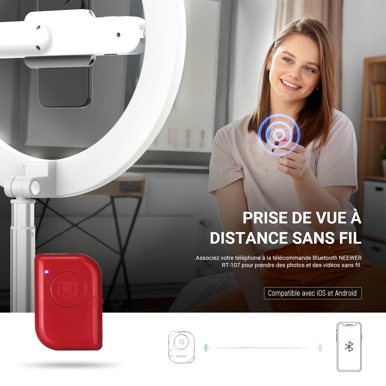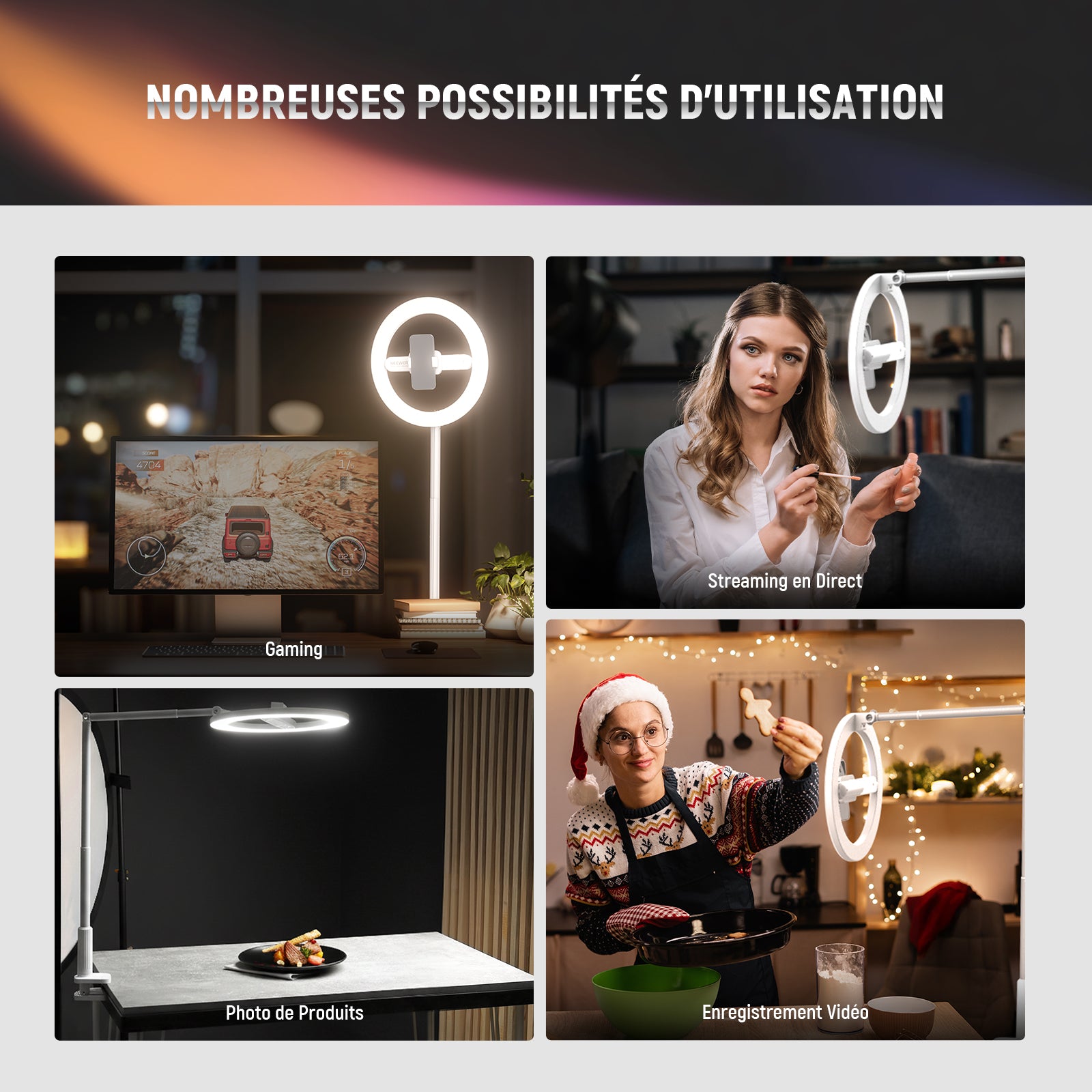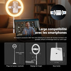 • 【Pour la photographie sur smartphone】 Son support universel à 360° pour smartphone diffuse un éclairage doux et direct,garantissant une qualité photo et vidéo optimale en modes portrait et paysage. Équipée d'une pince de bureau pour les prises de vue aériennes (selfies,vlogs,etc.), cette lampe annulaire est compatible avec iPhone 16 15 Pro Max Plus,smartphones Android et autres appareils Android.Accessoire indispensable pour créateurs de contenu,elle inclut une télécommande Bluetooth et 2 clips