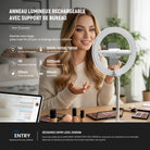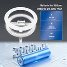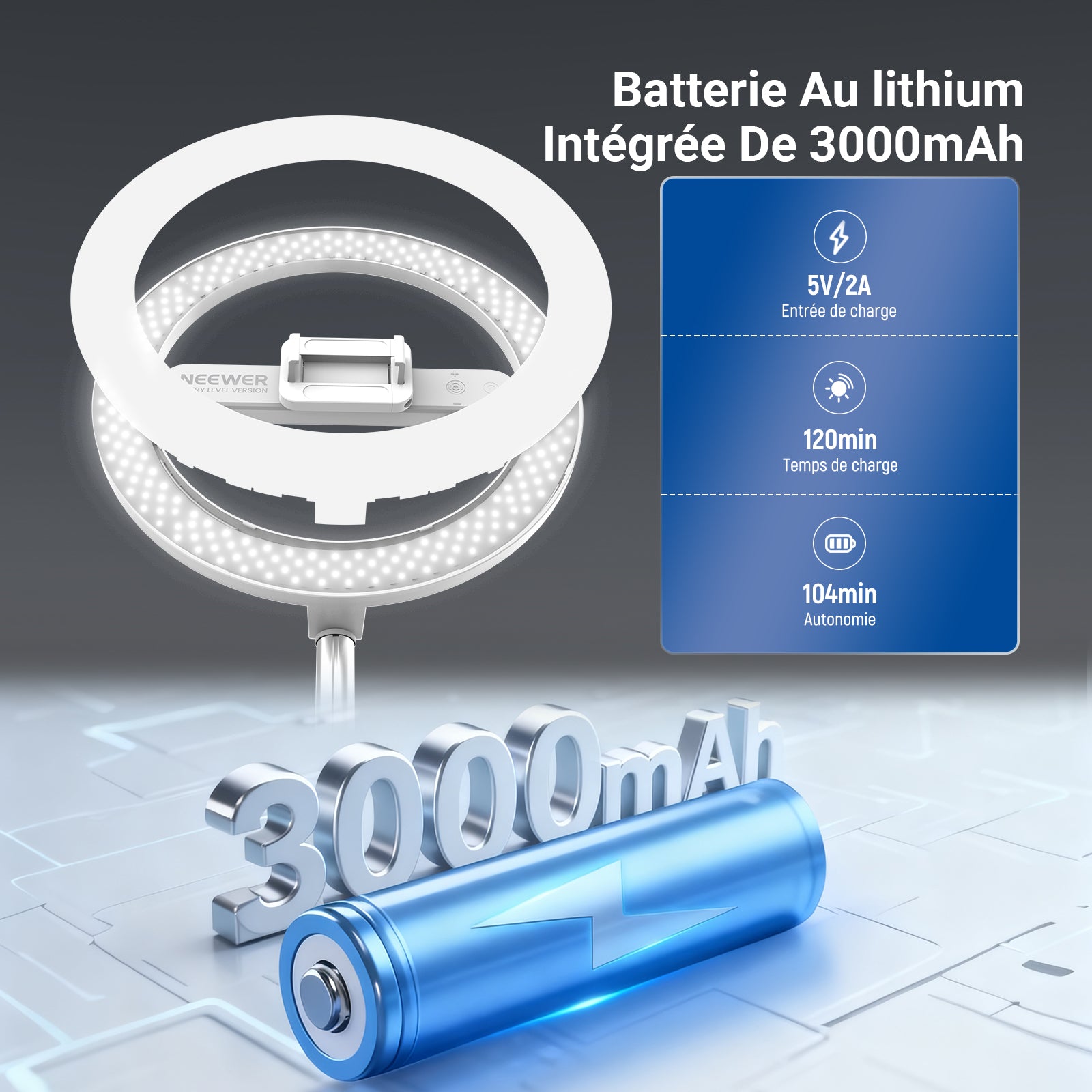 • 【Batterie intégrée de 3000mAh et alimentation USB】 Équipée d'une batterie rechargeable intégrée de 3000mAh, cette lampe annulaire portable est idéale pour les selfies sur téléphone et ordinateur. Offrant jusqu'à 104 minutes d'autonomie à pleine luminosité, cette lampe annulaire élimine les contraintes des câbles d'alimentation, contrairement aux modèles traditionnels alimentés par adaptateur. Elle est également compatible avec une alimentation USB 5V/2A ou 5V/1A pour un éclairage continu