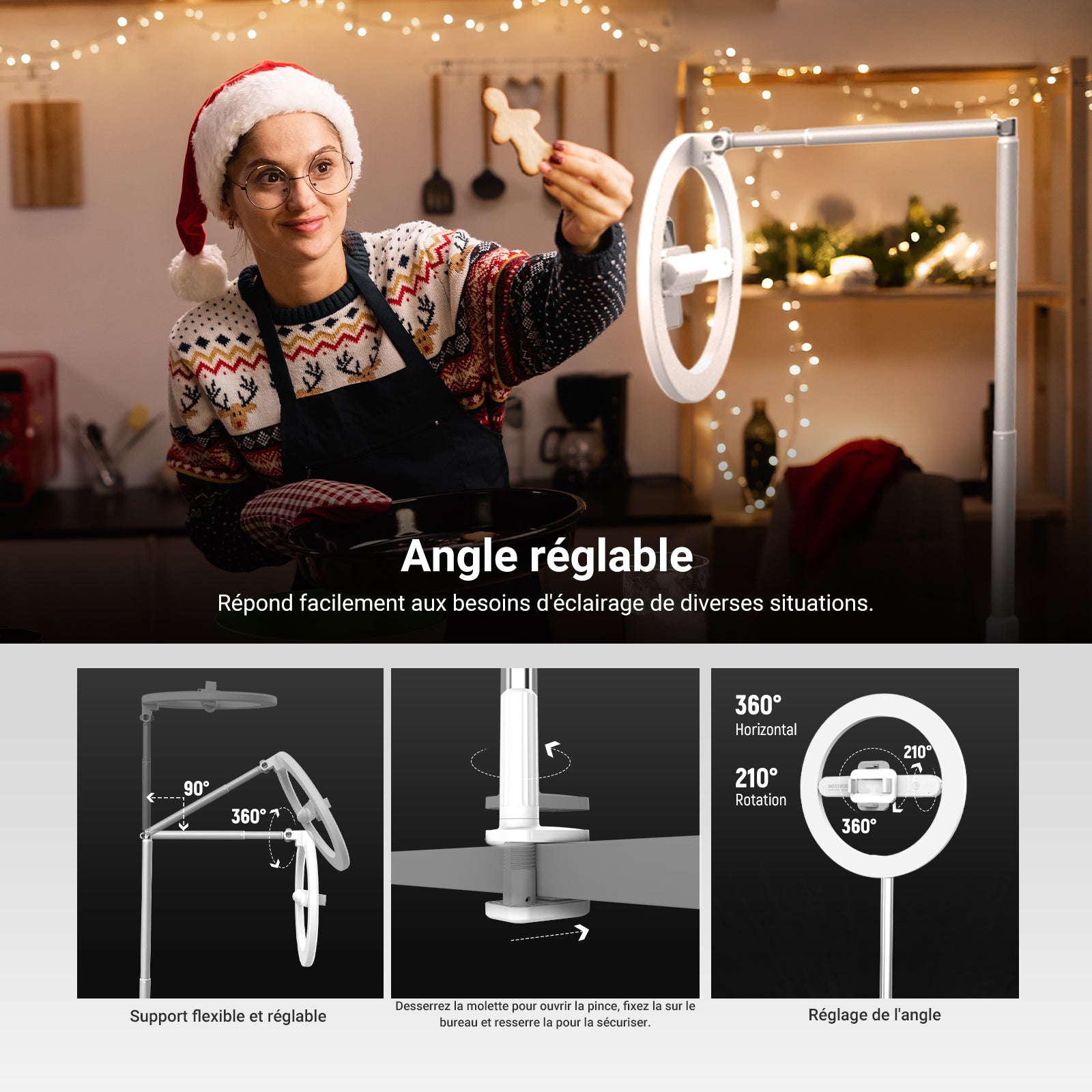 • 【Support de bureau extensible et angles flexibles】 Lampe annulaire est fournie avec un support de bureau réglable en alliage d'aluminium (61 à 115cm) offrant une stabilité et une durabilité optimales sur les surfaces planes jusqu'à 10cm d'épaisseur.Tête d'éclairage pivote à 360°,s'incline à 180° et colonne centrale se replie à 90° dans sa partie supérieure pour une grande polyvalence.Une clé Allen permet d'ajuster la tension des articulations pour une rotation fluide et une stabilité optimale.