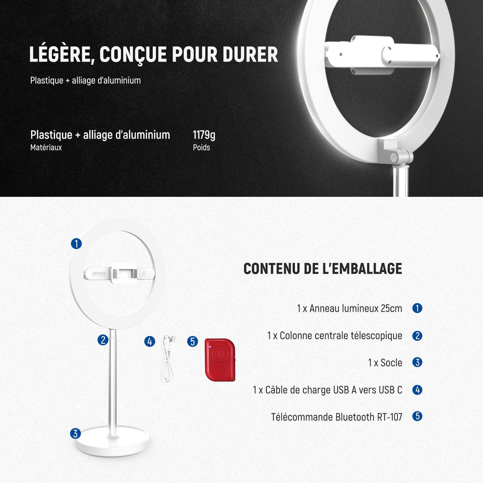 • Diamètre de l’anneau lumineux : 10" / 25 cm