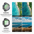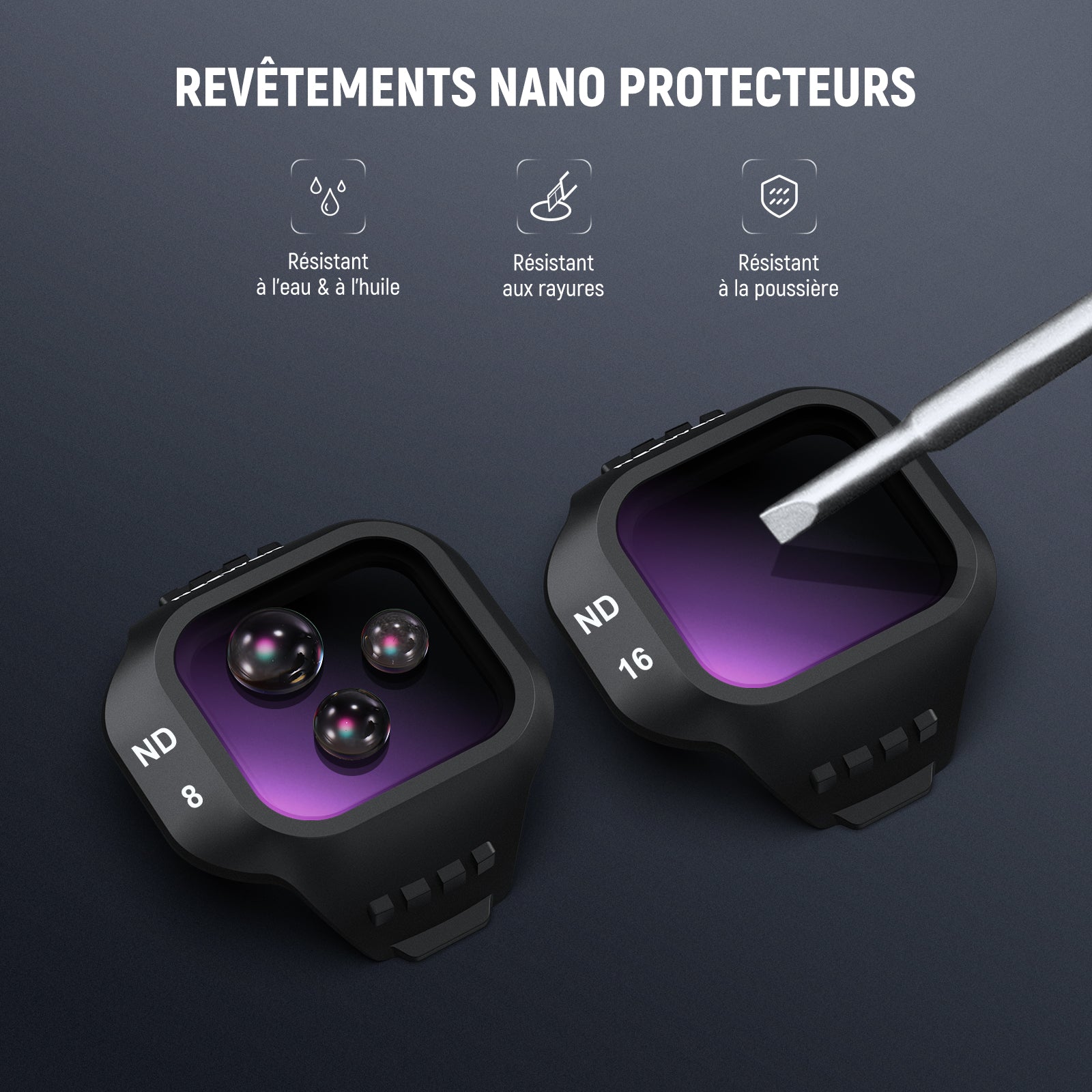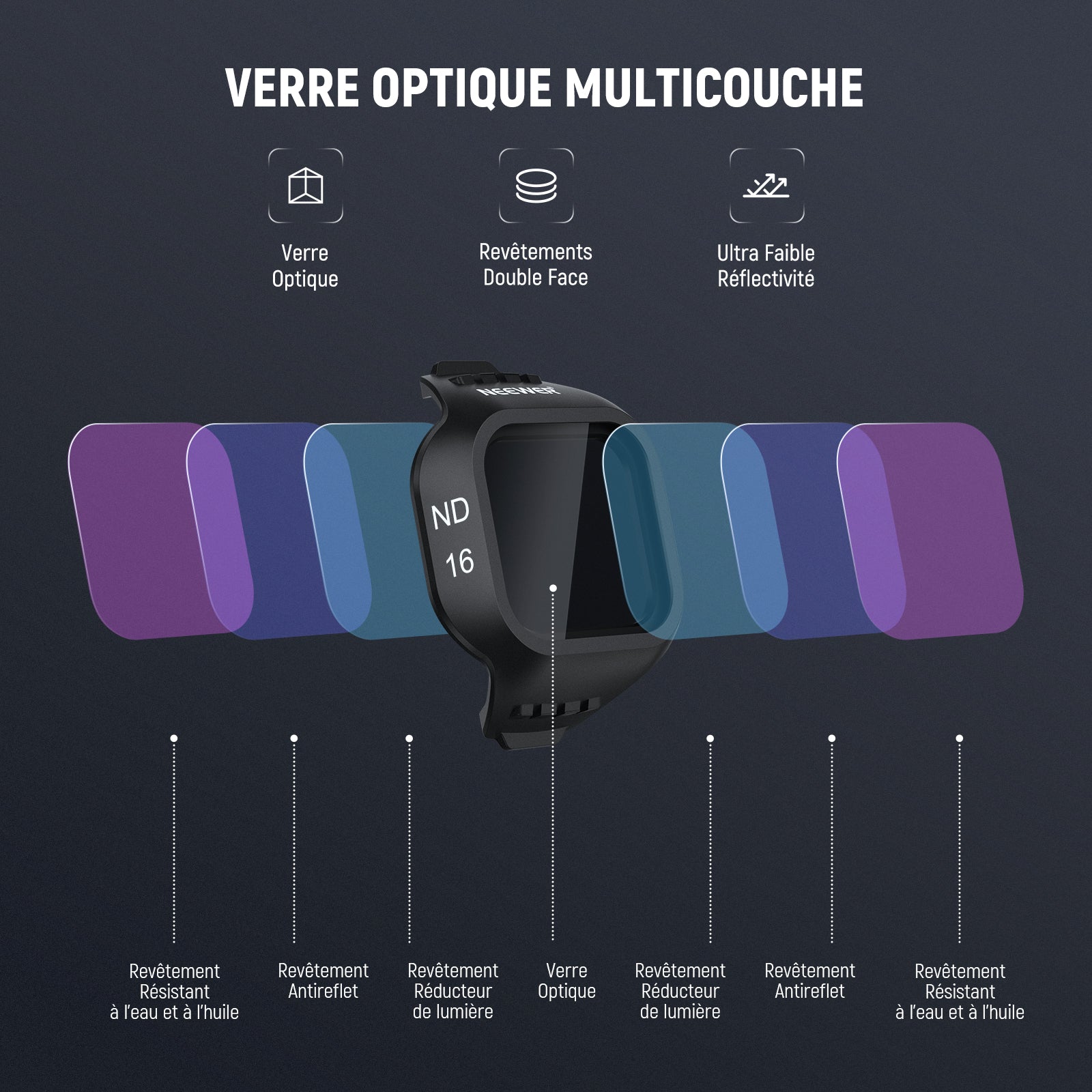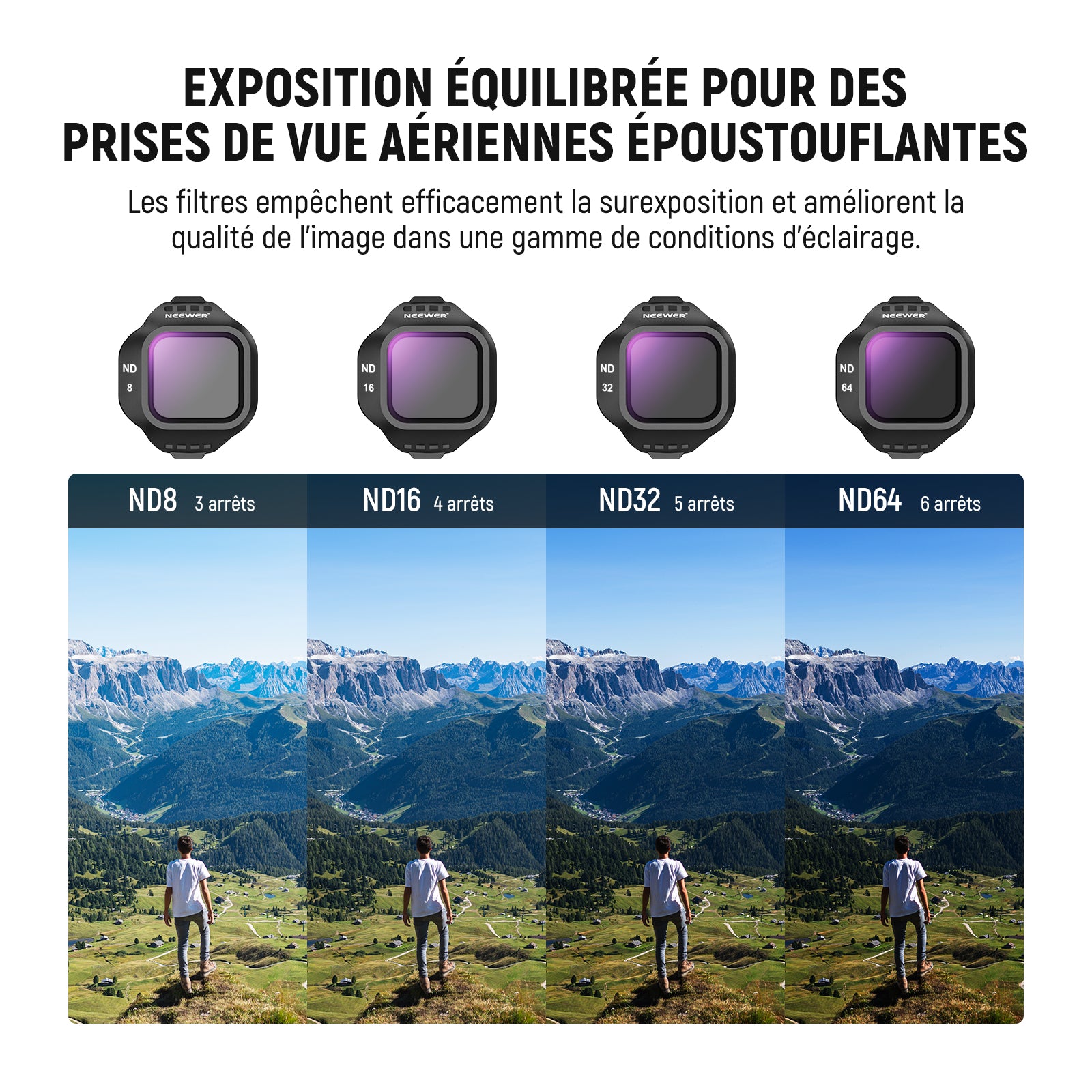 - Contrôle flexible de l'exposition : les filtres à densité neutre ND8, ND16, ND32, ND64 réduisent la lumière de 3, 4, 5, 6 arrêts respectivement pour éviter la surexposition dans différentes conditions et vous permettent de capturer les rivières, les cascades et les sentiers lumineux avec un flou de mouvement dynamique