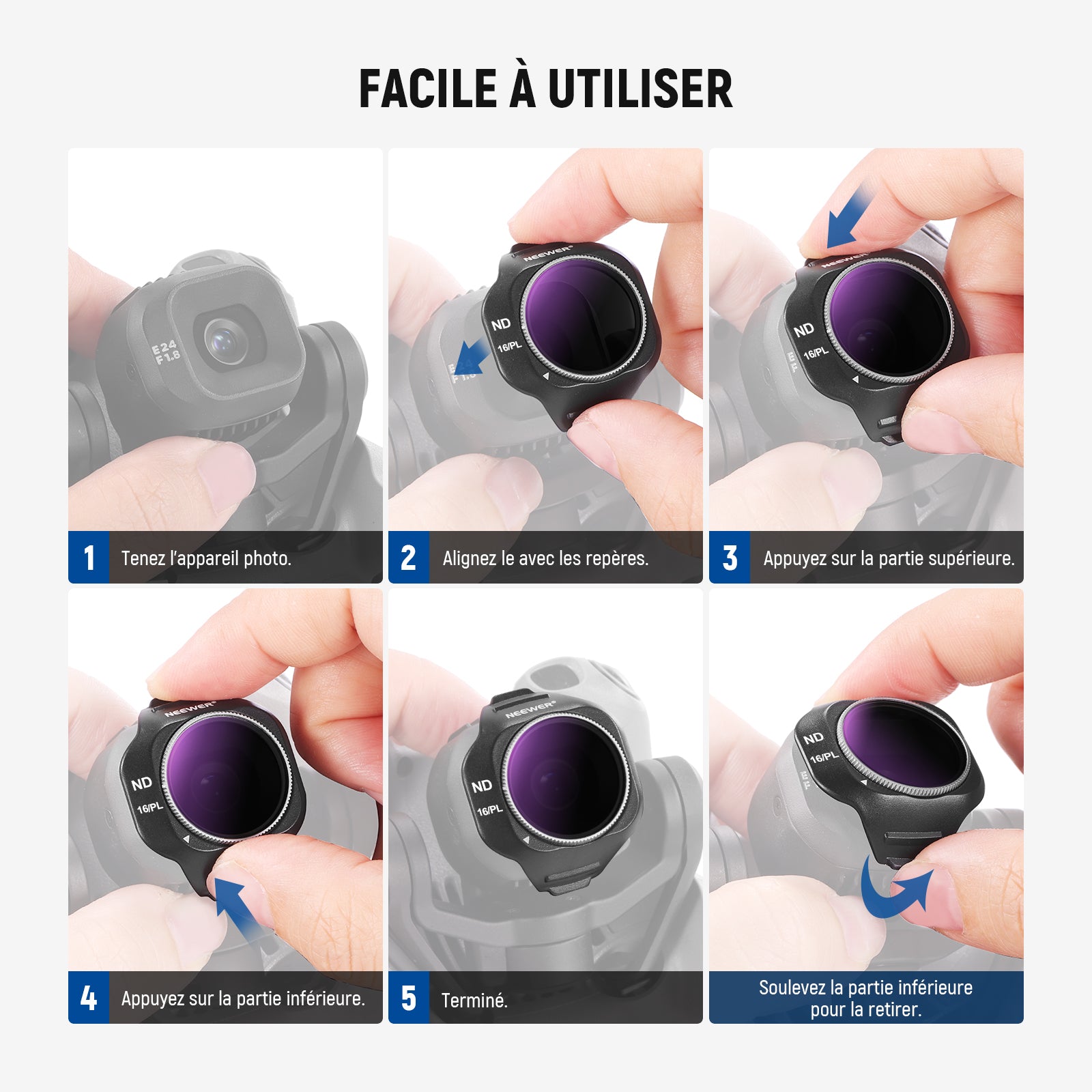 - Fixation rapide : maintenez l'appareil photo, alignez et enclenchez le filtre de haut en bas jusqu'à ce qu'il se verrouille en place. Le cadre léger de 1 g préserve l'équilibre et la précision du cardan
