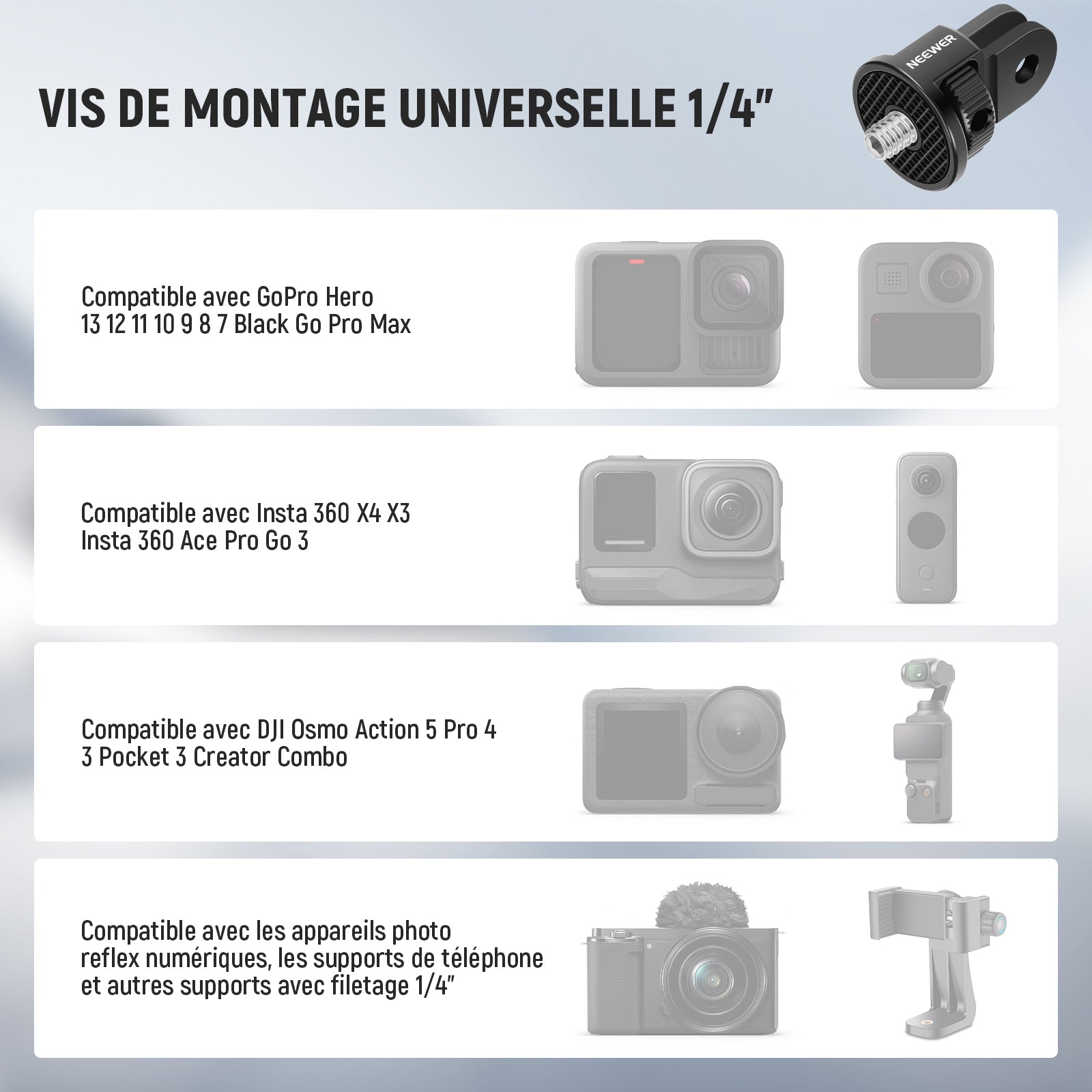 - Vis de montage universelle 6,35 mm : compatible avec GoPro Hero 13 12 11 10 9 8 7 Black Go Pro Max, compatible avec Insta360 X4 X3 Insta 360 Ace Pro Go 3, compatible avec DJI Osmo Action 5 Pro 4 3 Pocket 3 Creator Combo et autres caméras d'action, accessoires de caméra d'action accessoire adaptateur de trépied ments Kit ou pack tels que cages, cages téléphoniques et plates-formes vidéo avec filetage 6,35 mm