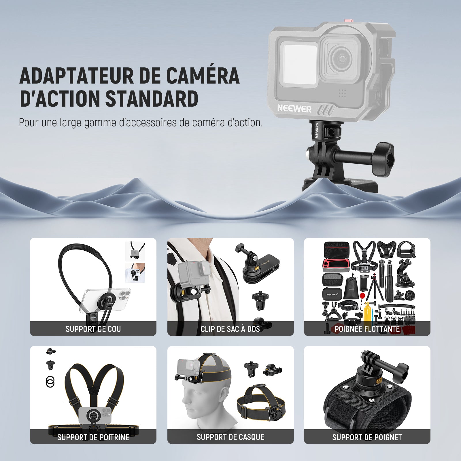 - Adaptateur de caméra d'action standard : doté de deux adaptateurs à griffes, ce support convient à une large gamme d'accessoires de caméra d'action, y compris les supports de poitrine, les supports de cou, les supports de poignet, les supports de casque, les clips de sac à dos, les poignées flottantes, et plus encore. Remarque : la longue vis moletée n'est pas incluse