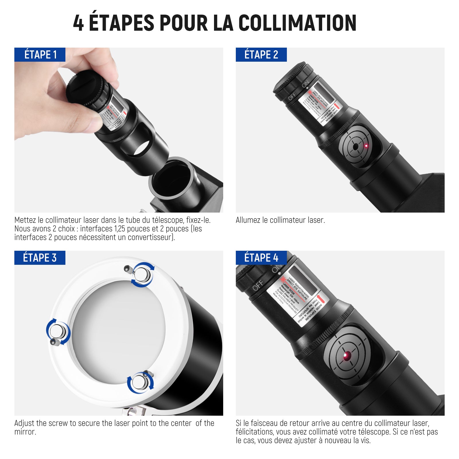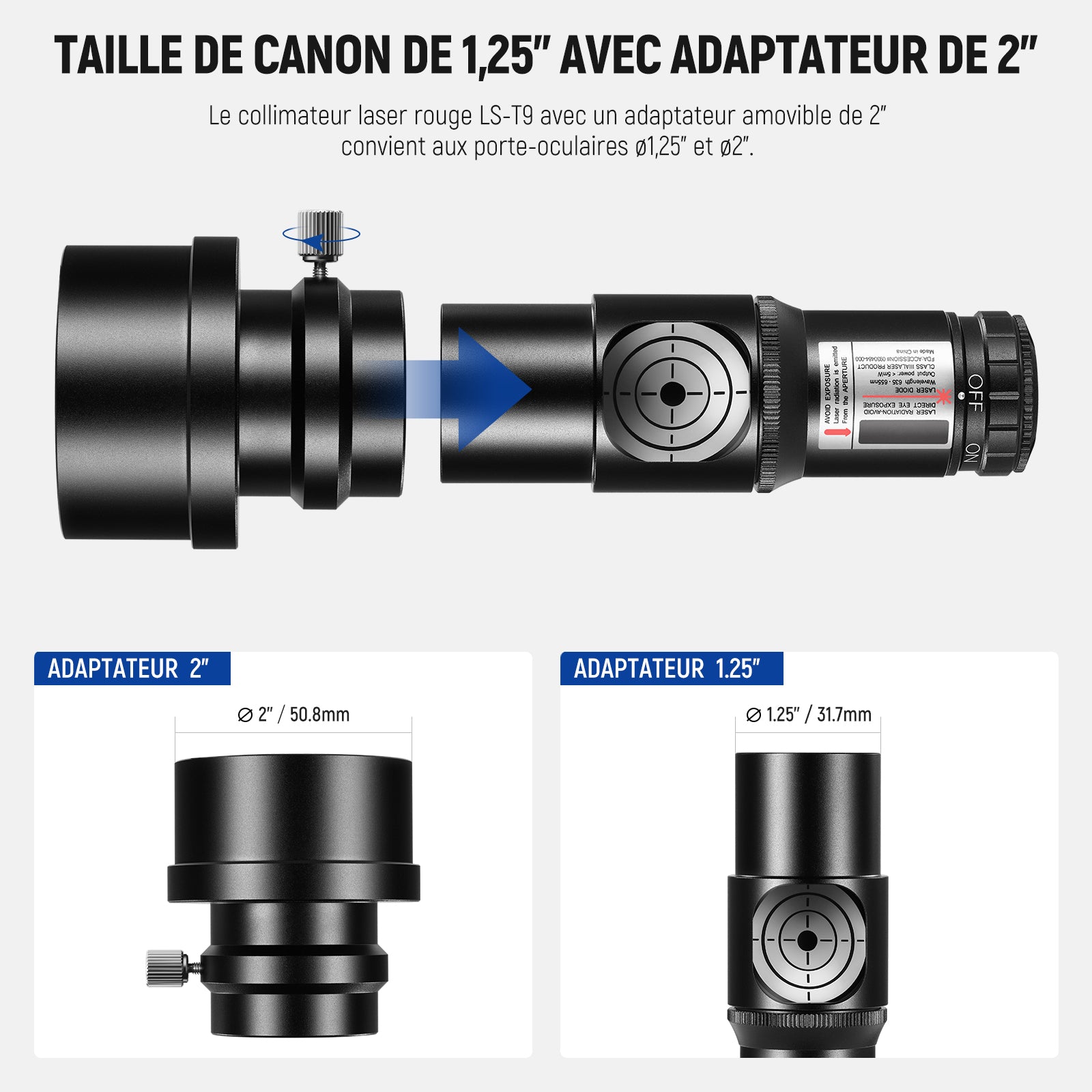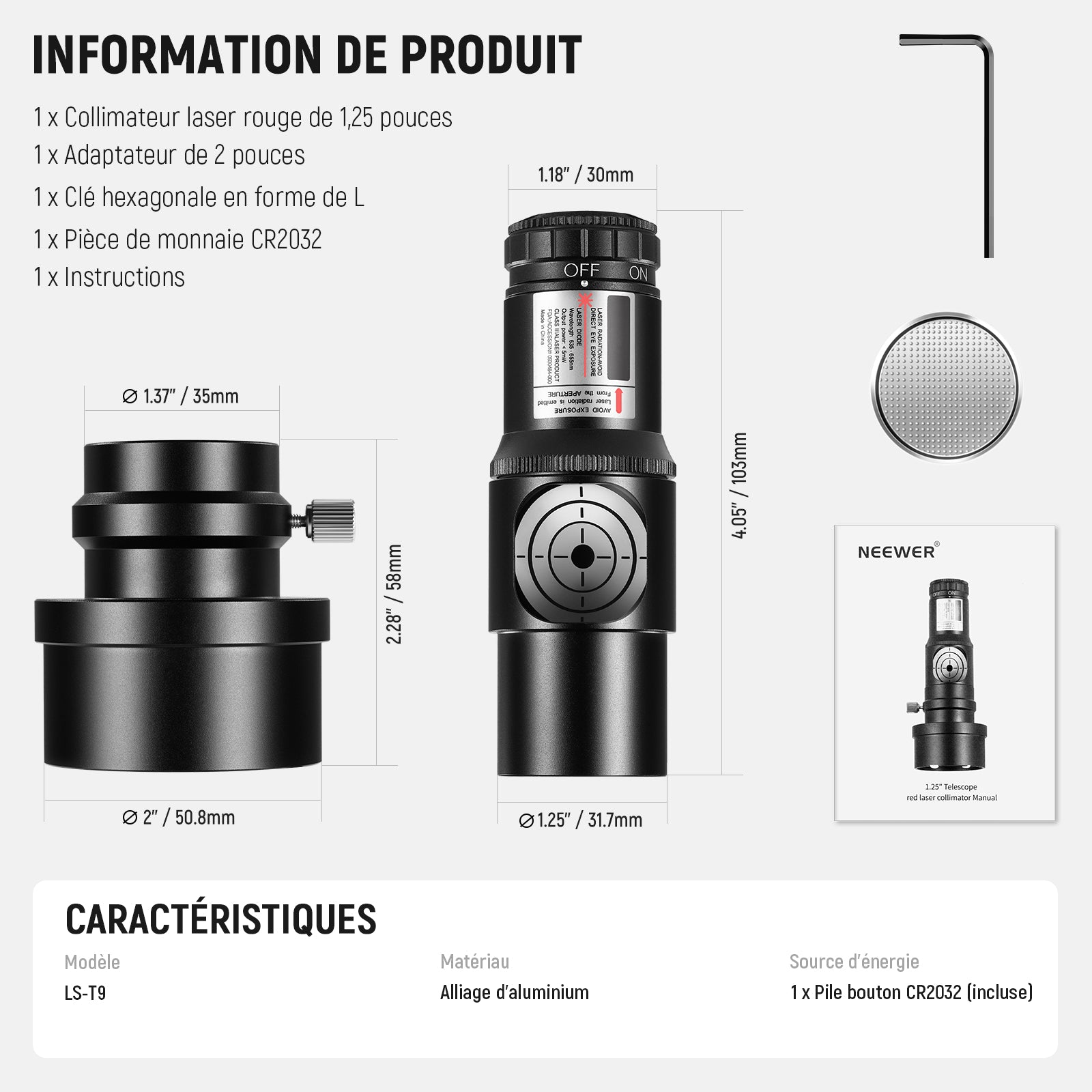 - 【Pour les télescopes à réflecteur】 Le collimateur laser rouge NEEWER LS-T9 1,25" vous permet de régler avec précision l'optique de votre télescope à réflecteur et d'aligner les éléments optiques du télescope le long du trajet de la lumière pour des images nettes et détaillées. Un adaptateur de 2 pouces le rend compatible avec Newtonian Schmidt Cassegrain et plus de télescopes différents