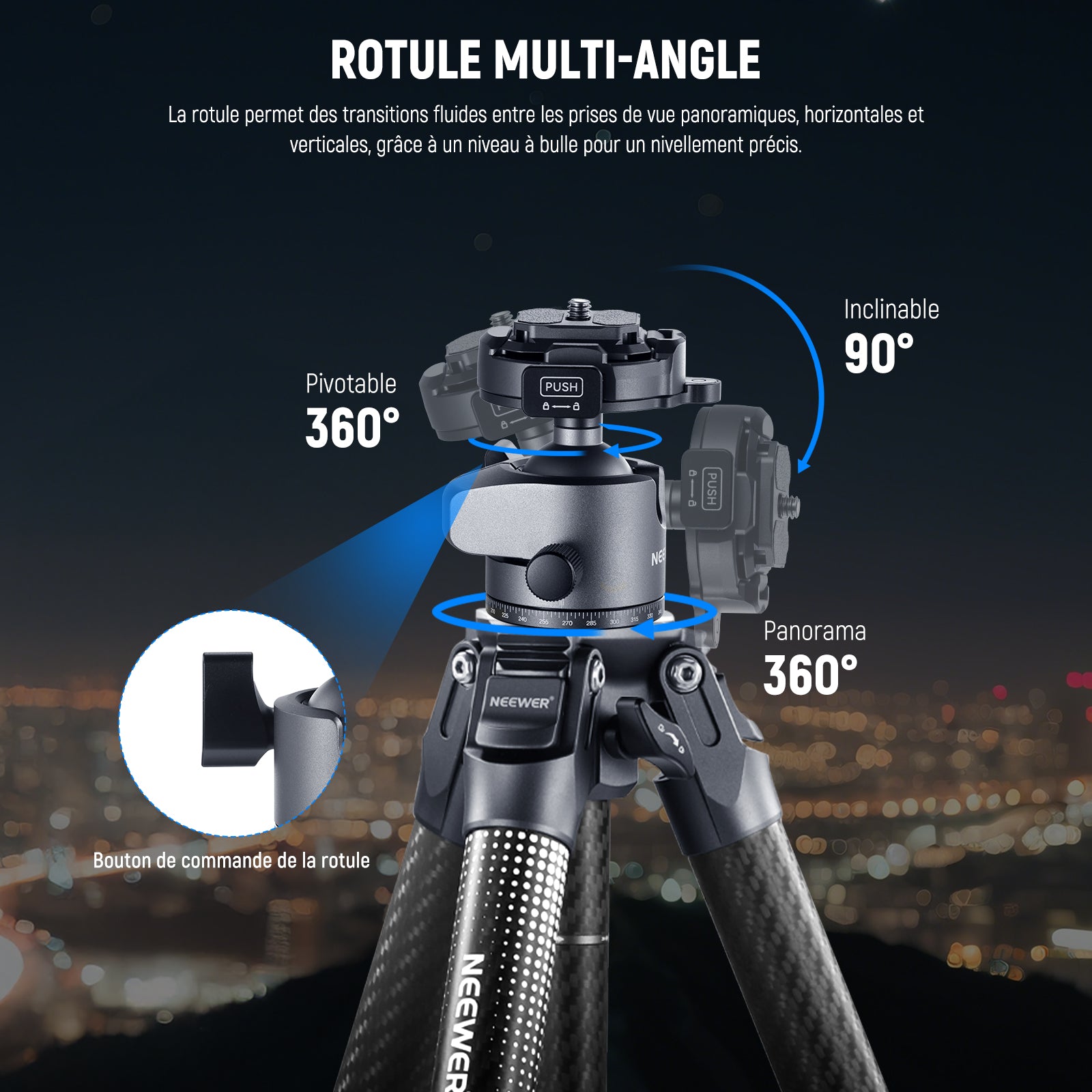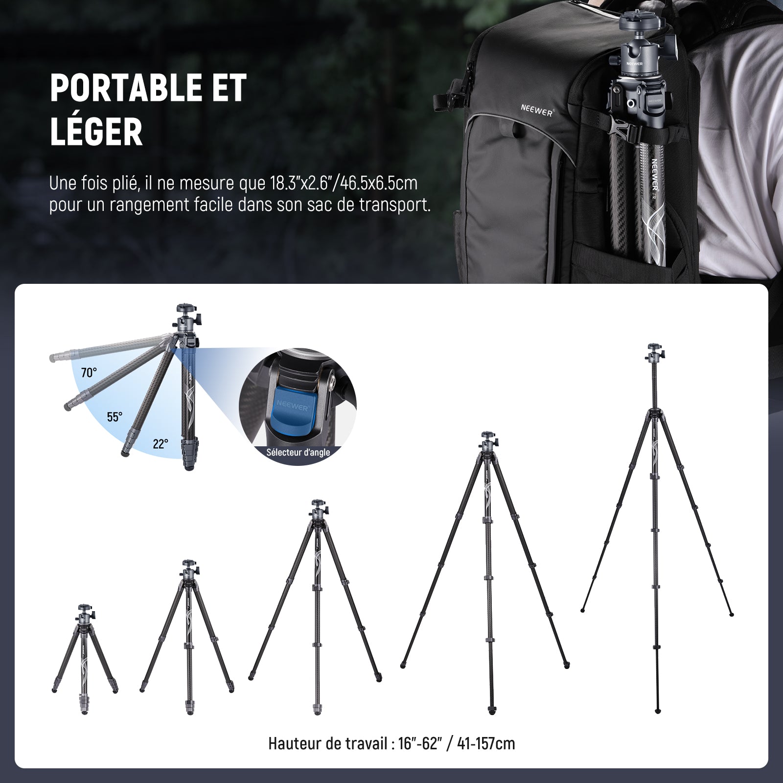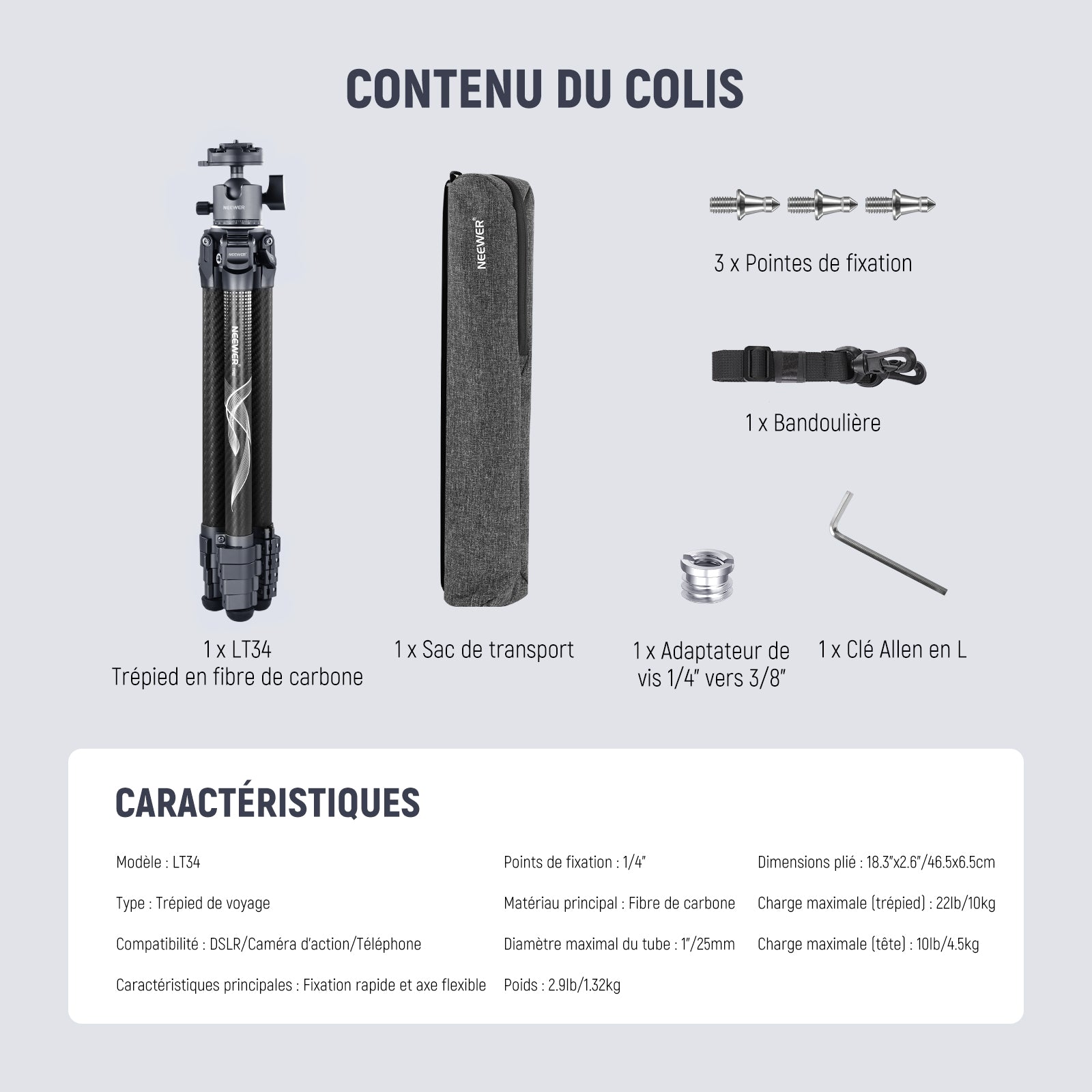 - 【Trépied de voyage compact 100 % fibre de carbone 】 Le LT34, issu de la série de trépieds portables NEEWER LITETRIP, est un trépied vidéo léger en fibre de carbone de 1,32 kg pour téléphone et appareil photo. Il est doté d'un tube de 25 mm pour une meilleure stabilité et d'une capacité de charge de 10 kg. Une fois plié, il ne mesure que 46,5 x 6,5 cm et se glisse facilement dans un sac de transport. Il est également équipé d'un crochet pour contrepoids sur l'axe central
