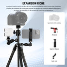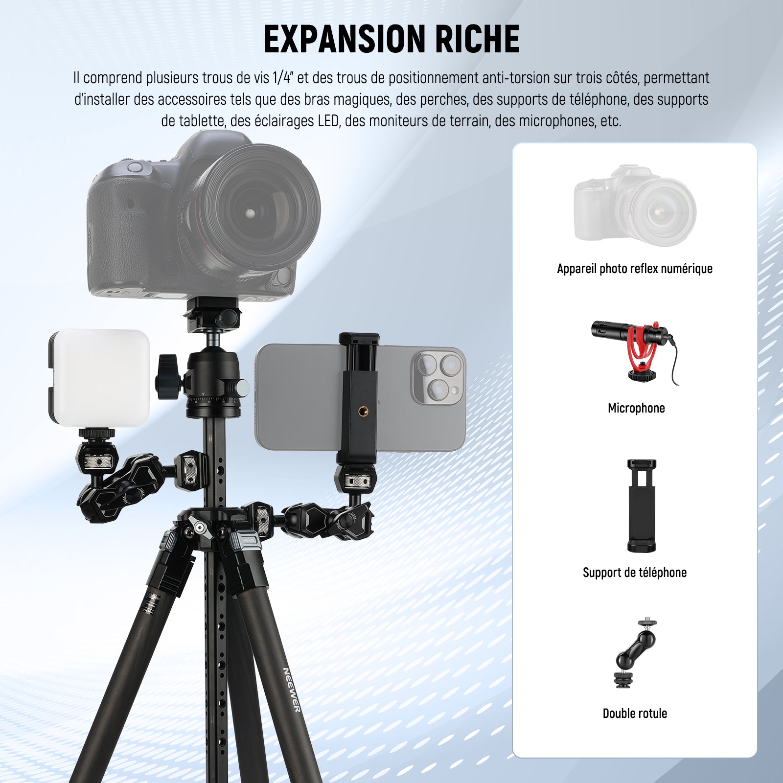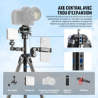 - Axe central avec trous d'extension : le trépied avec une colonne centrale polyvalente qui élève la hauteur et peut également être inversée pour des prises de vue à faible angle. Il comprend plusieurs trous de vis de 6,35 mm et des trous de positionnement anti-torsion sur trois côtés, permettant des fixations telles que les bras magiques, les bras de perche, les supports de téléphone, les supports de tablette, les lumières LED, les moniteurs de terrain, les microphones, etc. pour divers besoins de photographie. Idéal en tant que créateur de contenu, influenceur essentiel doit avoir un équipement professionnel de vlogging de caméra haute