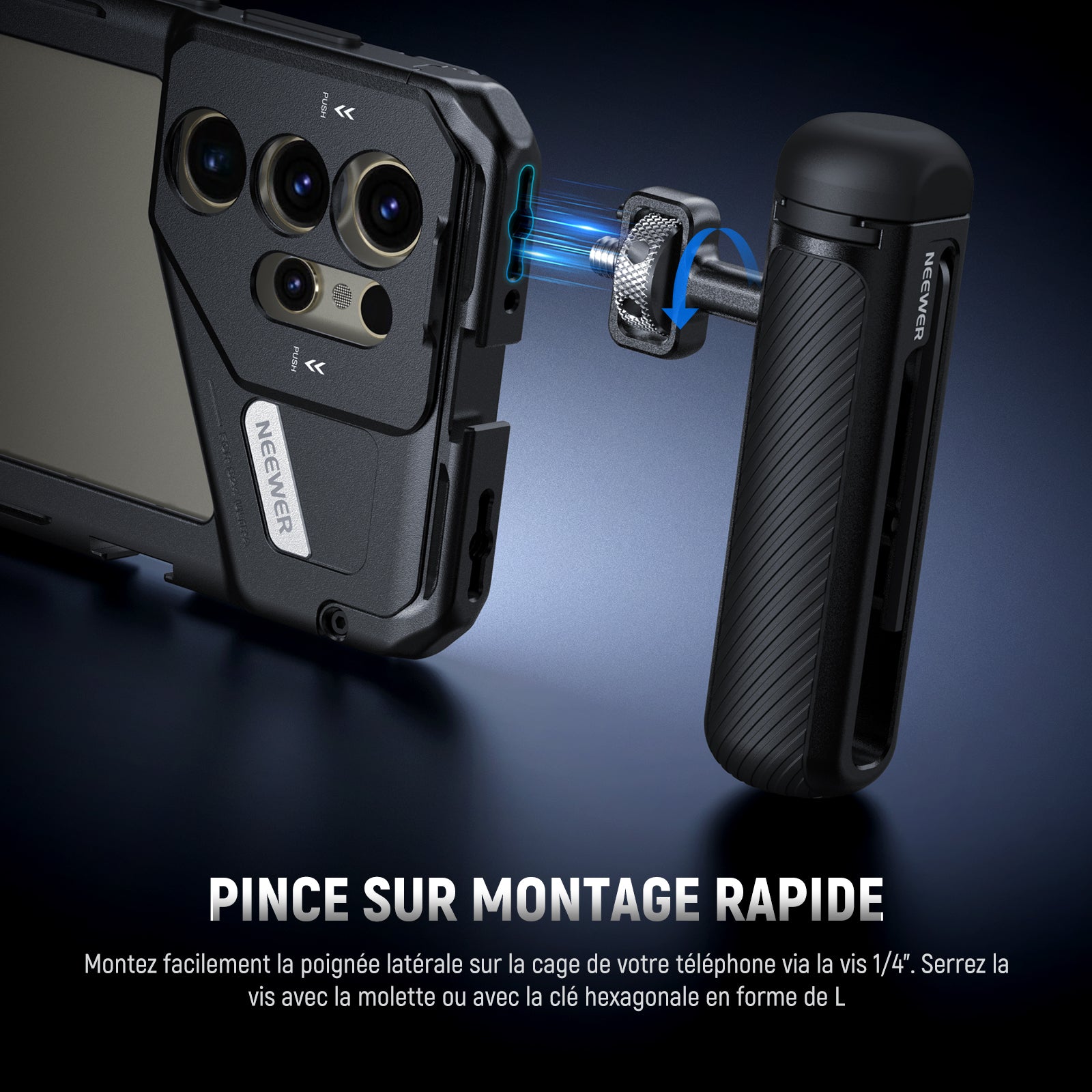 - 【Vis 1/4" et goupille de localisation anti-torsion】 montez facilement la poignée latérale sur la cage de votre téléphone via la vis 1/4". Serrez la vis avec la molette ou avec la clé hexagonale en forme de L. La goupille de positionnement anti-torsion empêche efficacement les vibrations et la déviation