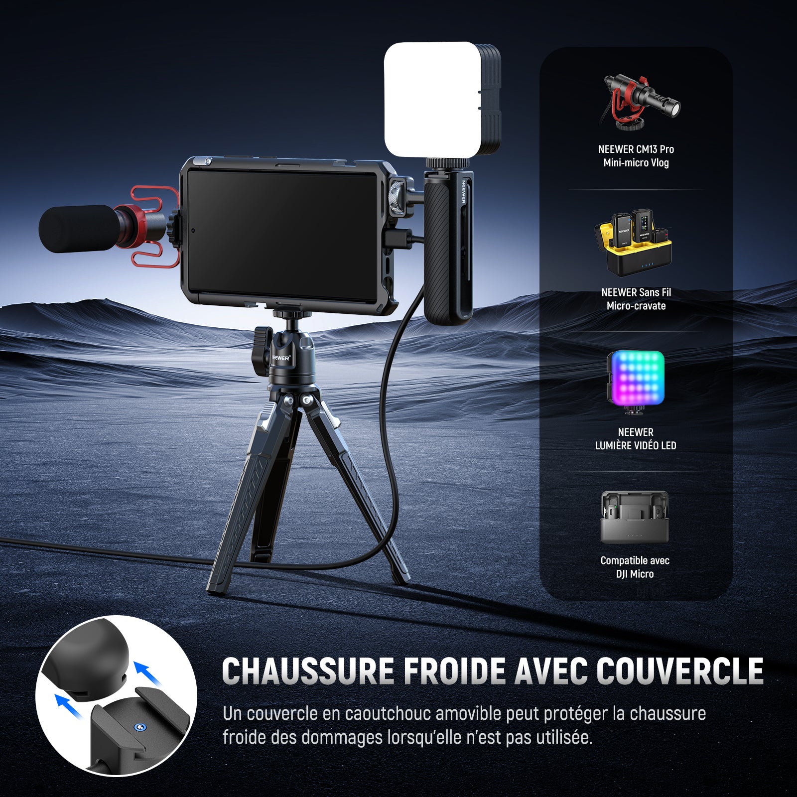 - 【Sabot froid avec broche anti-arrêt et couvercle】 La chaussure froide intégrée peut connecter le microphone NEEWER CM14 Pro, le microphone cravate sans fil CM22/CM28, la lampe vidéo LED PL81/RGB61/RGB62, et est compatible avec DJI micro. Un couvercle en caoutchouc amovible peut protéger la chaussure froide des dommages. Une goupille anti-arrêt à ressort rétractable peut empêcher l'accessoire monté de glisser