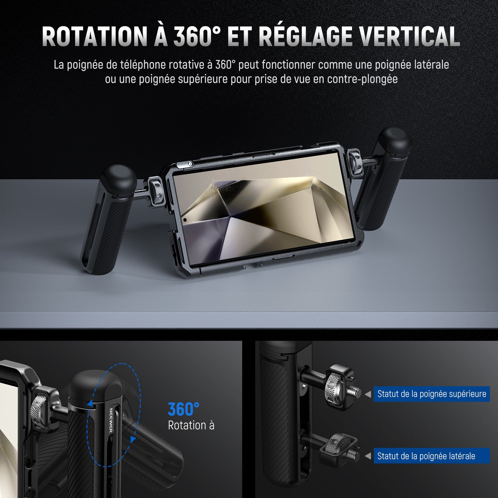 - 【Rotation à 360° et réglage vertical】 la poignée de téléphone rotative à 360° peut fonctionner comme une poignée latérale ou une poignée supérieure pour la prise de vue à faible angle. Il prend en charge un réglage vertical de 2,2"/55mm pour équilibrer le centre de gravité