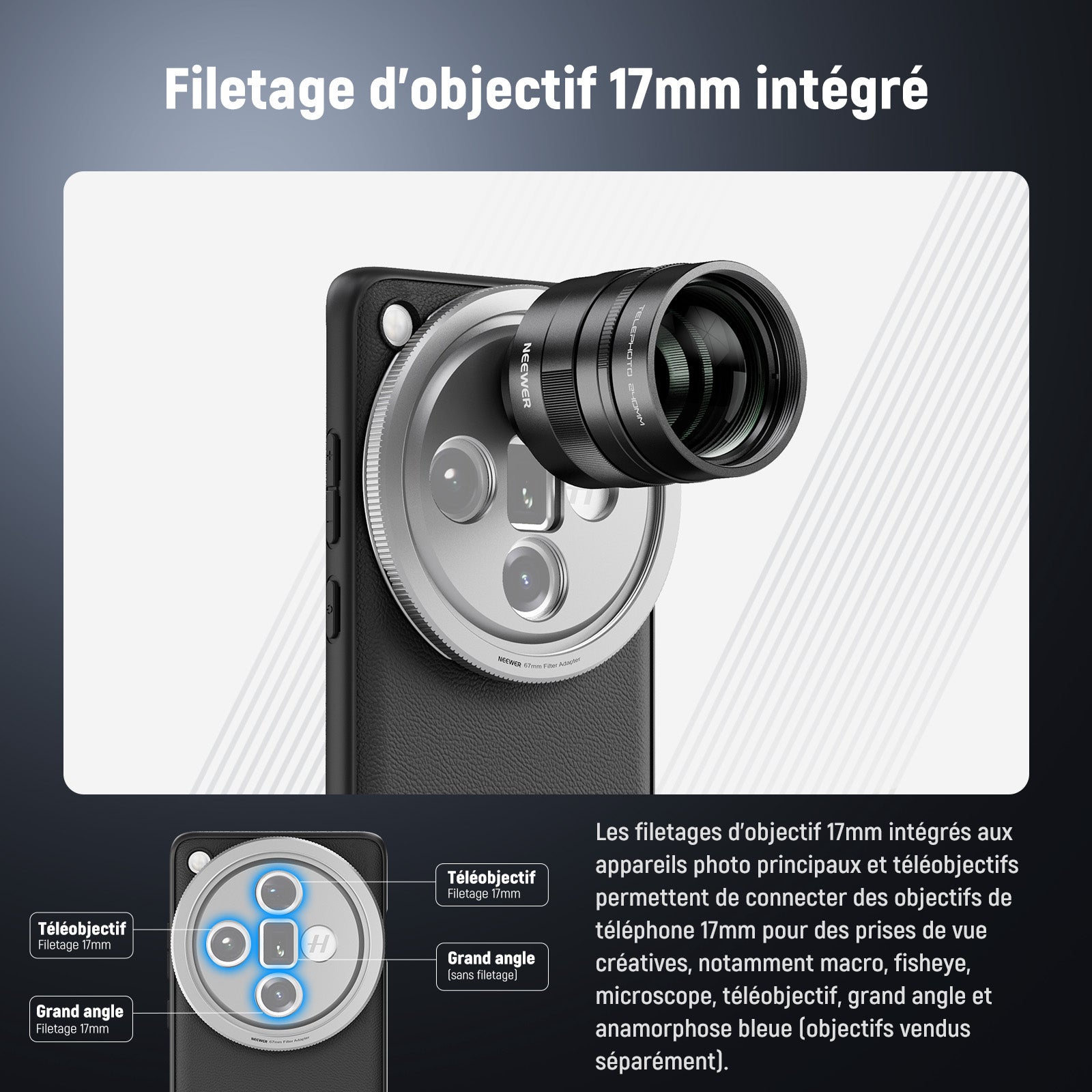 - 【Filetages d'objectif 17mm intégrés】 Les filetages d'objectif 17mm intégrés sur les appareils photo principaux et téléobjectifs connectent les objectifs de téléphone 17mm pour des prises de vue créatives, notamment macro, fisheye, microscope, téléobjectif, grand angle et anamorphique bleu (objectifs vendus séparément)