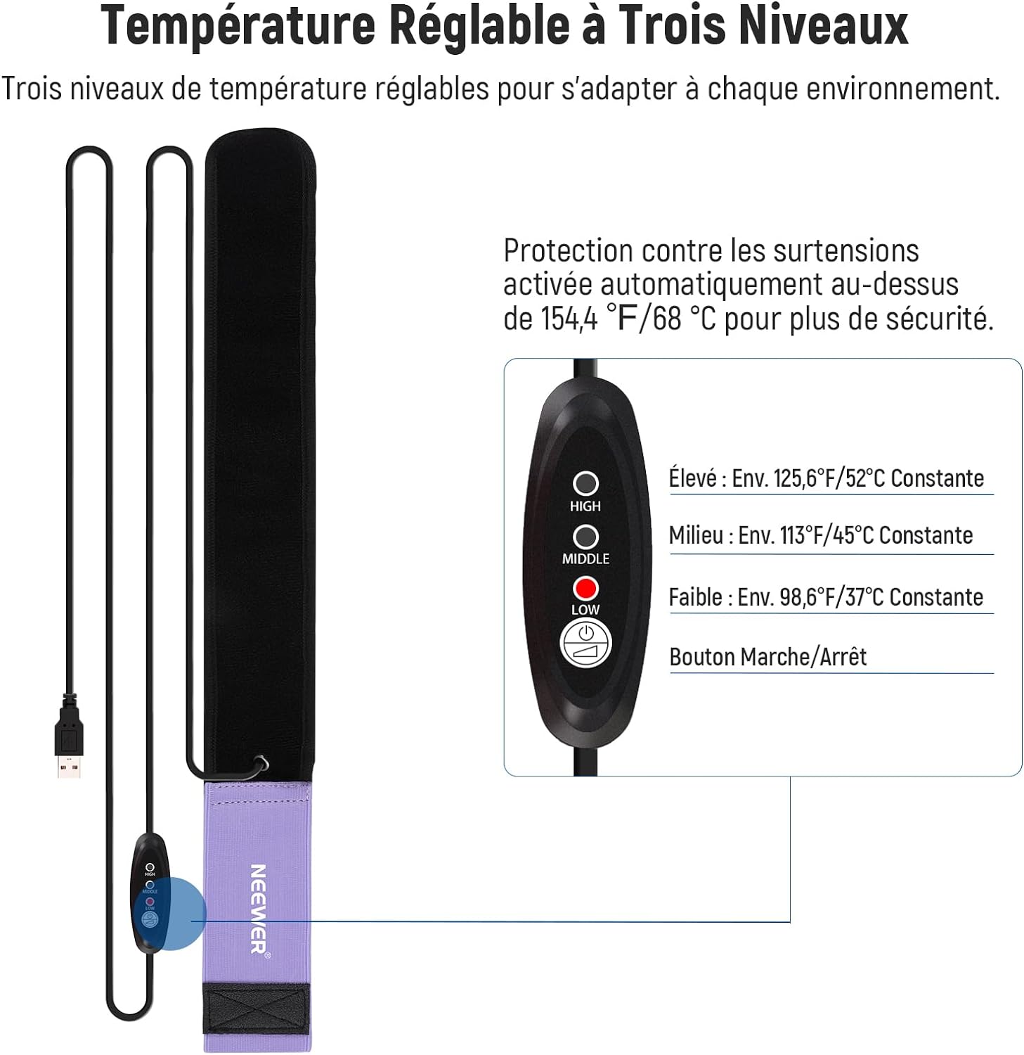 - 【Alimentation USB Sécurisée 5V 2A】grâce au câble USB de 1,8m, le chauffage d'objectif peut recevoir l'alimentation de n'importe quelle source d'alimentation USB avec une sortie 5V 2A et dispose d'une protection contre la surchauffe/surtension pour une utilisation en toute sécurité. Un régulateur offre 3 niveaux de température (Élevé: 125,6°F/52°C; Moyen:113°F/45°C; Bas:98,6°F/37°C) pour différents environnements