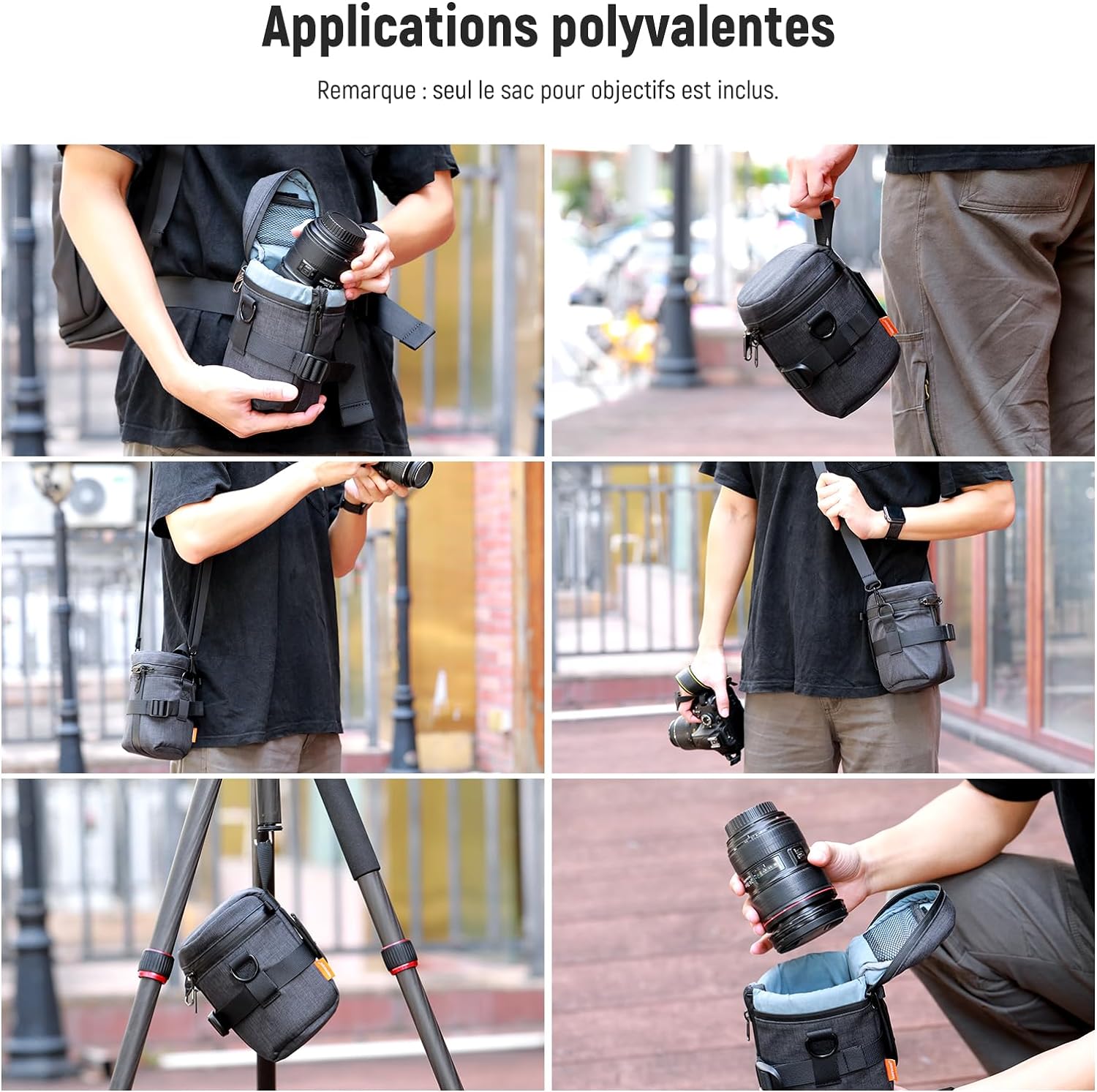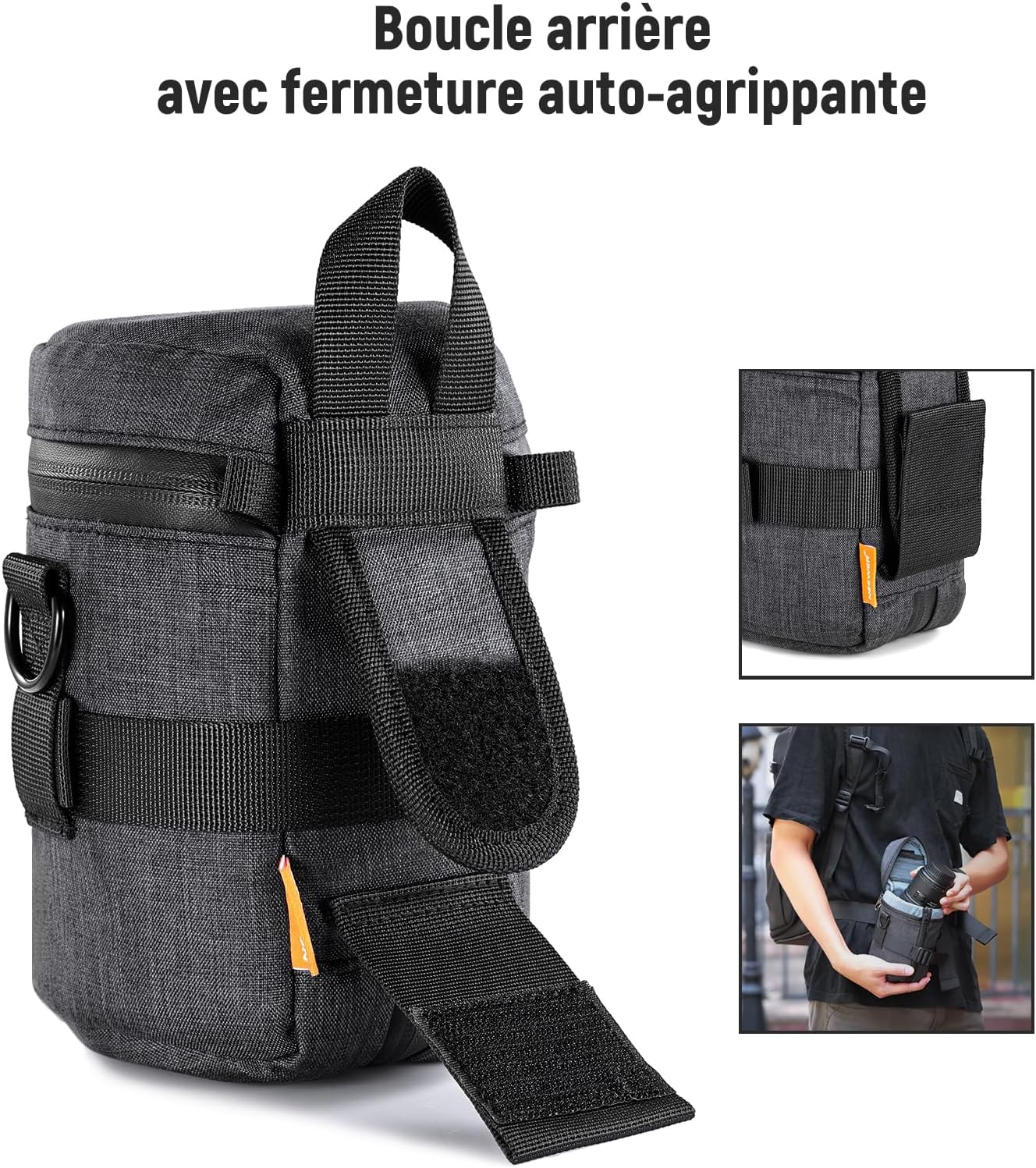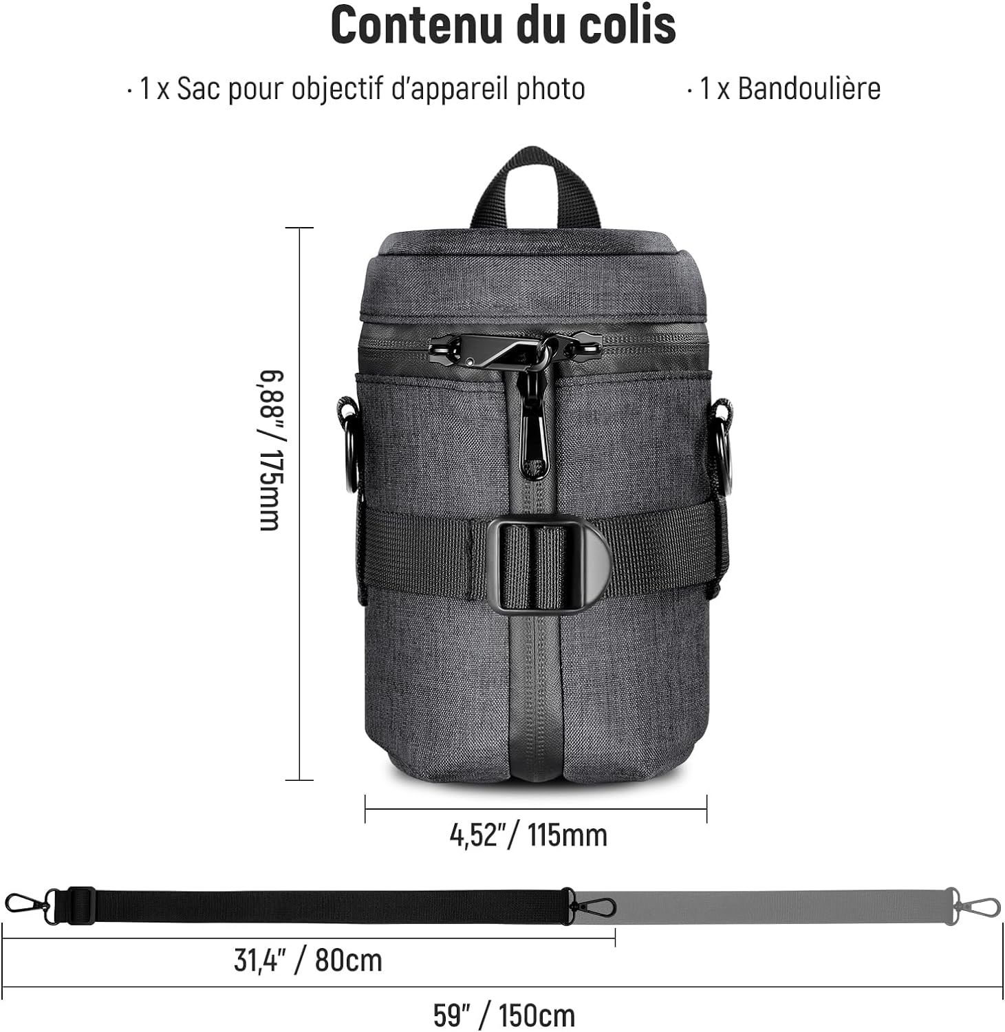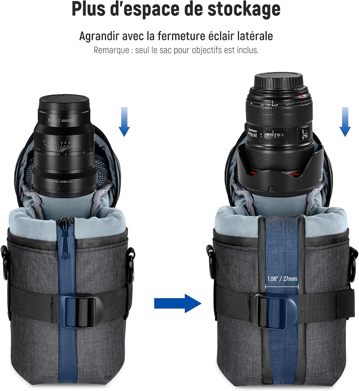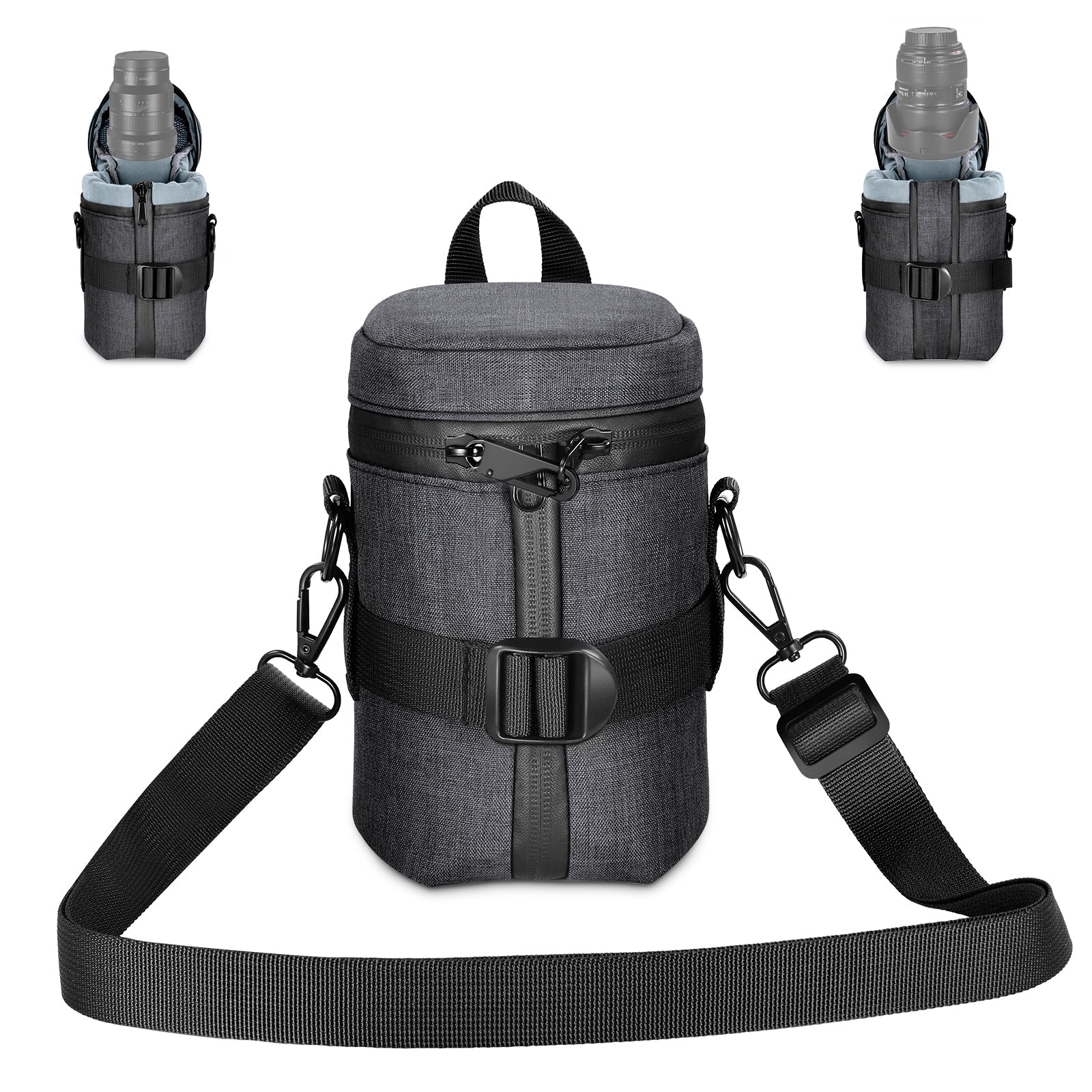 - 【Fermeture éclair latérale extensible pour une capacité agrandie】 Avec une extension supplémentaire de 1,06"/27mm, ce sac peut accueillir la plupart des objectifs d'appareil photo reflex numérique et sans miroir d'un diamètre et d'une hauteur inférieurs à 3,9" x 5,5"/100 x 140mm. La boucle réglable s'enroule pour s'enrouler en toute sécurité. Maintenez vos objectifs en place, évitant ainsi les secousses ou les rayures.