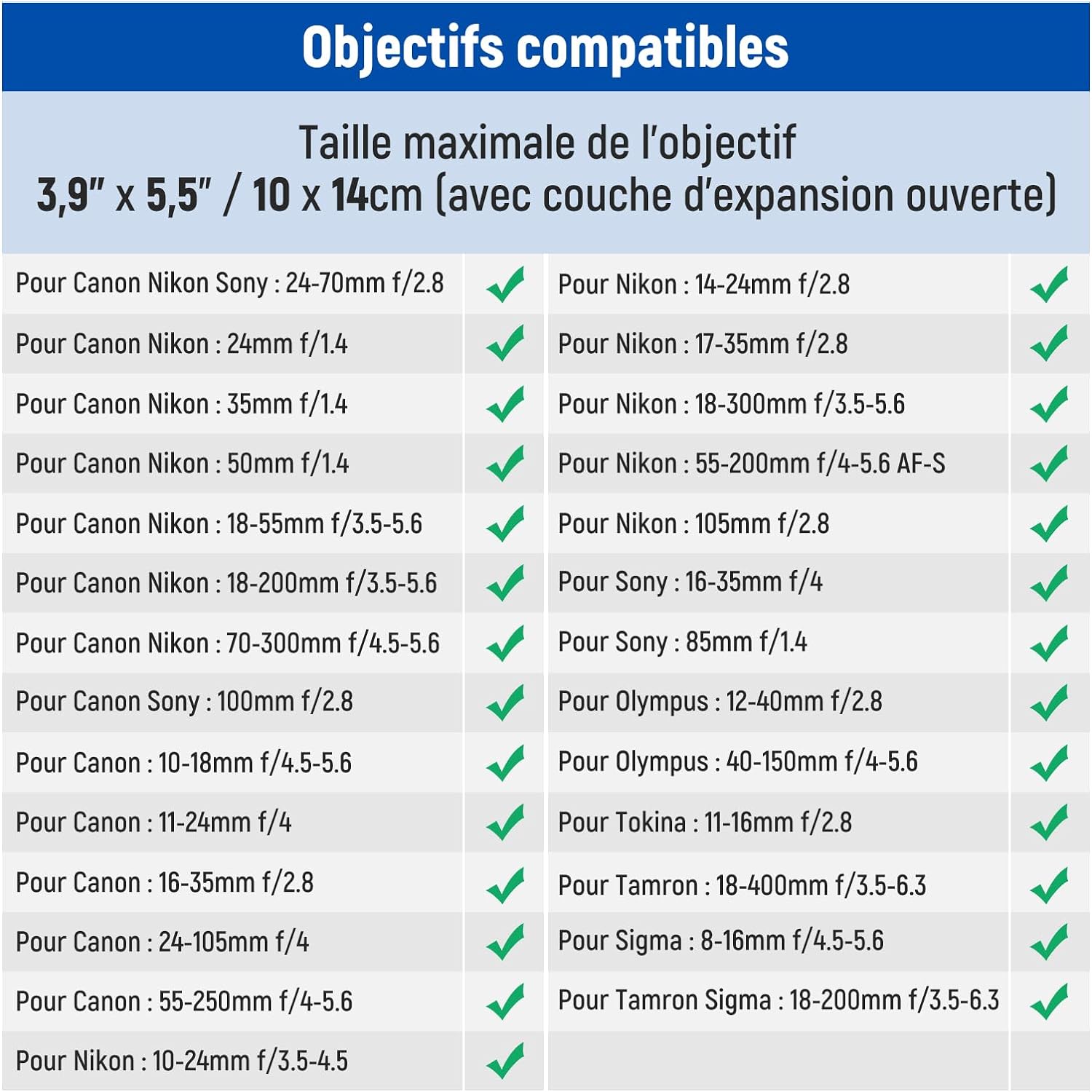 - 【Compatibilité plus large】Compatible avec Canon Nikon 18-55mm ou 18-200mm f/3,5-5,6, 50mm f/1,4, 70-300mm f/4,5-5,6, 18-200mm f/3,5-5,6. Compatible avec Sony 16-35mm f /4, 85mm f/1,4, 24-70mm f/2,8. Compatible avec Olympus 12-40mm f/2,8, 40-150mm f/4-5,6. Compatible avec Sigma Tamron 18-200mm f/3,5-6,3, 18-400mm. f/3,5-6,3. Compatible avec Tokina 11-16mm f/2,8, etc.