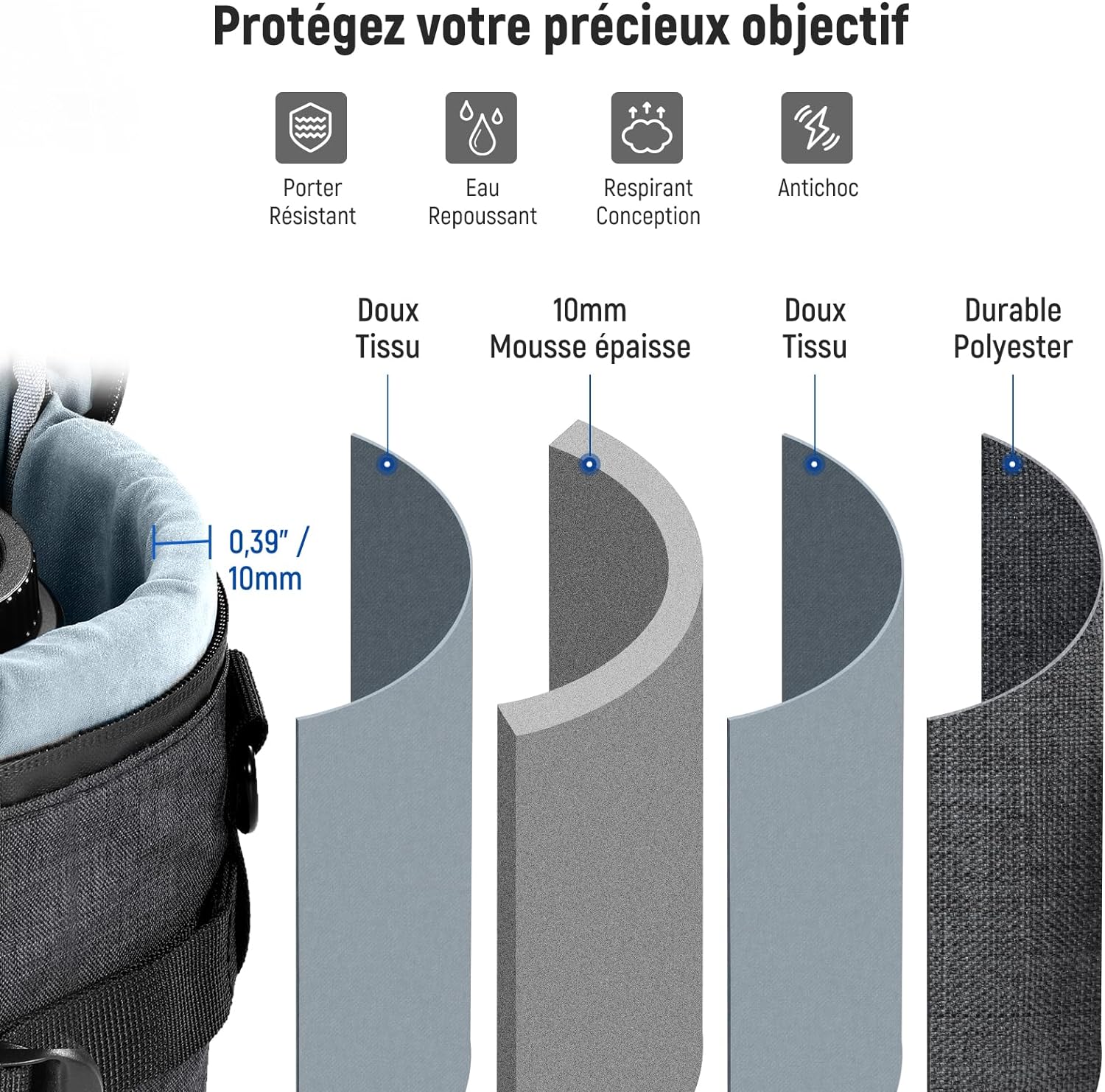- 【Étui pour objectif épais de qualité supérieure】Ce sac de protection est doté d'un rembourrage en mousse épaisse de 10mm et d'une doublure en velours doux, offrant une absorption efficace des chocs pour protéger les objectifs de votre caméra reflex numérique ou sans miroir. Même avec un coussinet en mousse surélevé à l'intérieur de la fermeture éclair supérieure pour éviter toute rayure accidentelle. Une poche en filet pour un rangement pratique des filtres et autres petits accessoires