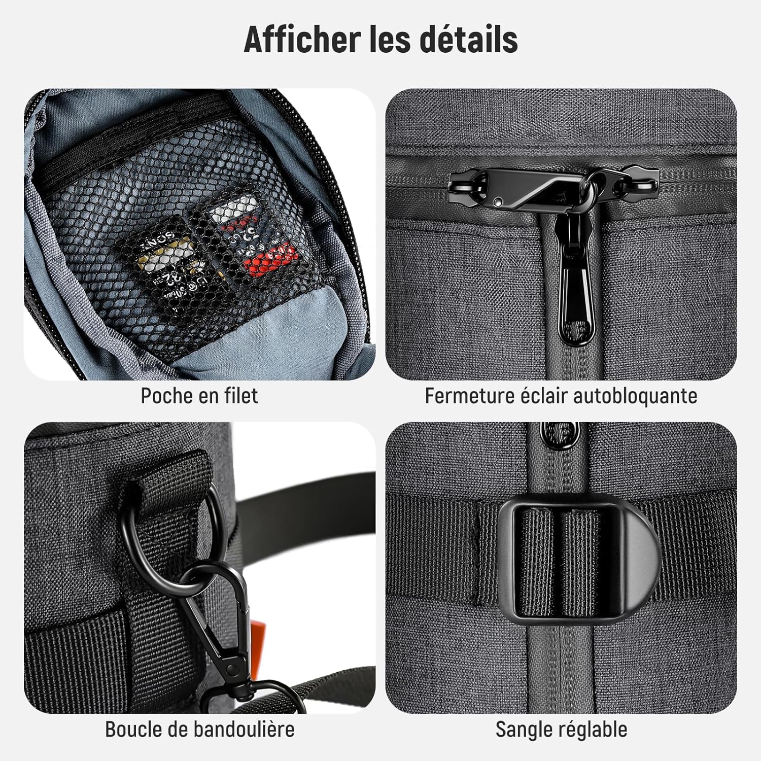 - 【Sac de transport hydrofuge】 Fabriqué en polyester de première qualité, ce sac léger de 250g offre une durabilité contre une utilisation quotidienne. Le design élégant et compact convient à la photographie en extérieur et se glisse facilement dans un sac à dos ou une valise. Pour un accès rapide, fixez-le à votre ceinture ou sac à dos à l'aide de la boucle arrière et des attaches auto-agrippantes. Vous pouvez utiliser la bandoulière fournie pour un port croisé ou une utilisation à la main.
