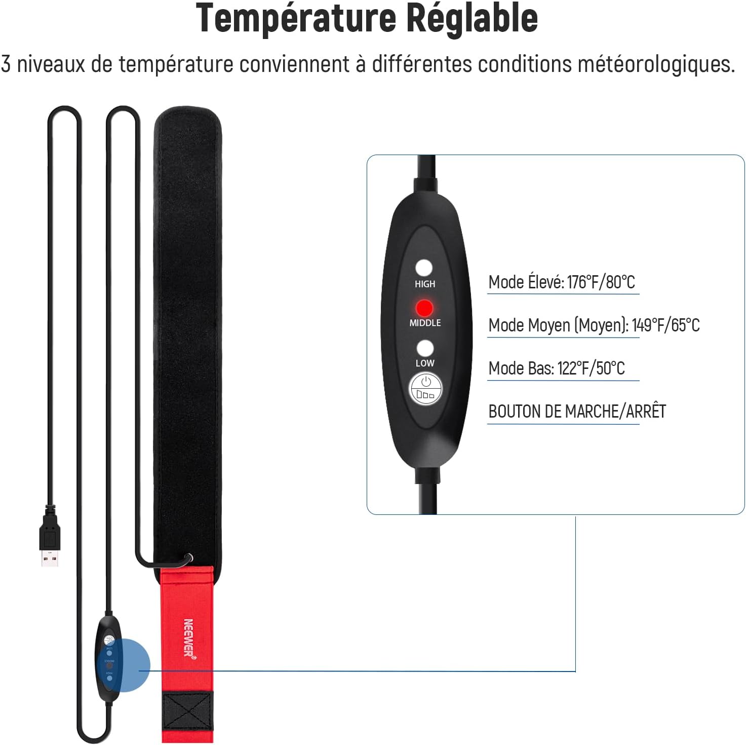 - 【3 Niveaux de Température】 Un régulateur de température offre 3 réglages (Mode Haut: 55-65°C; Mode Moyen: 45-55°C; Mode Bas: 35-45°C) pour s'adapter à différents environnements météorologiques.