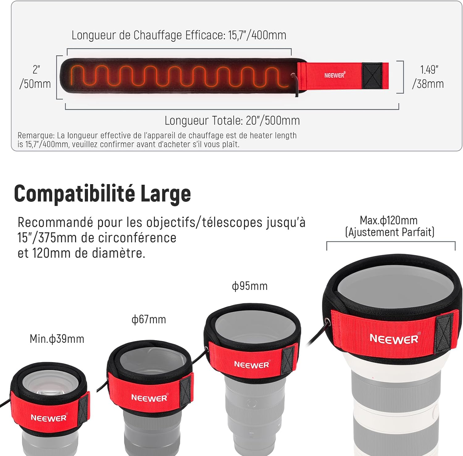 - 【Longueur de Chauffage Efficace de 12"/300mm】 Éliminez la rosée, le brouillard et la condensation avec notre chauffe-objectif spécialement conçu pendant la photographie par temps froid. Pour des performances optimales et un chauffage uniforme, il est recommandé de l'utiliser sur des objectifs ou des télescopes d'une circonférence allant jusqu'à 10,8"/275mm et un diamètre de 86mm
