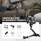 - 【Bras Magique Articulé avec Super Pince】 Avec deux bras articulés reliés par une articulation 360° à friction, ce bras magique 18cm et pince supporte les appareils photo numériques, les panneaux LED, les micros, les moniteurs (compatible avec Atomos Ninja V), les adaptateurs pour action cam... La super pince se monte sur des tubes, des poteaux, des tables ou s'installe sur des cages de caméra, des trépieds ou d'autres supports grâce aux trous de positionnement 1/4" et 3/8". Charge max 2kg