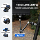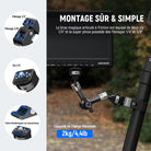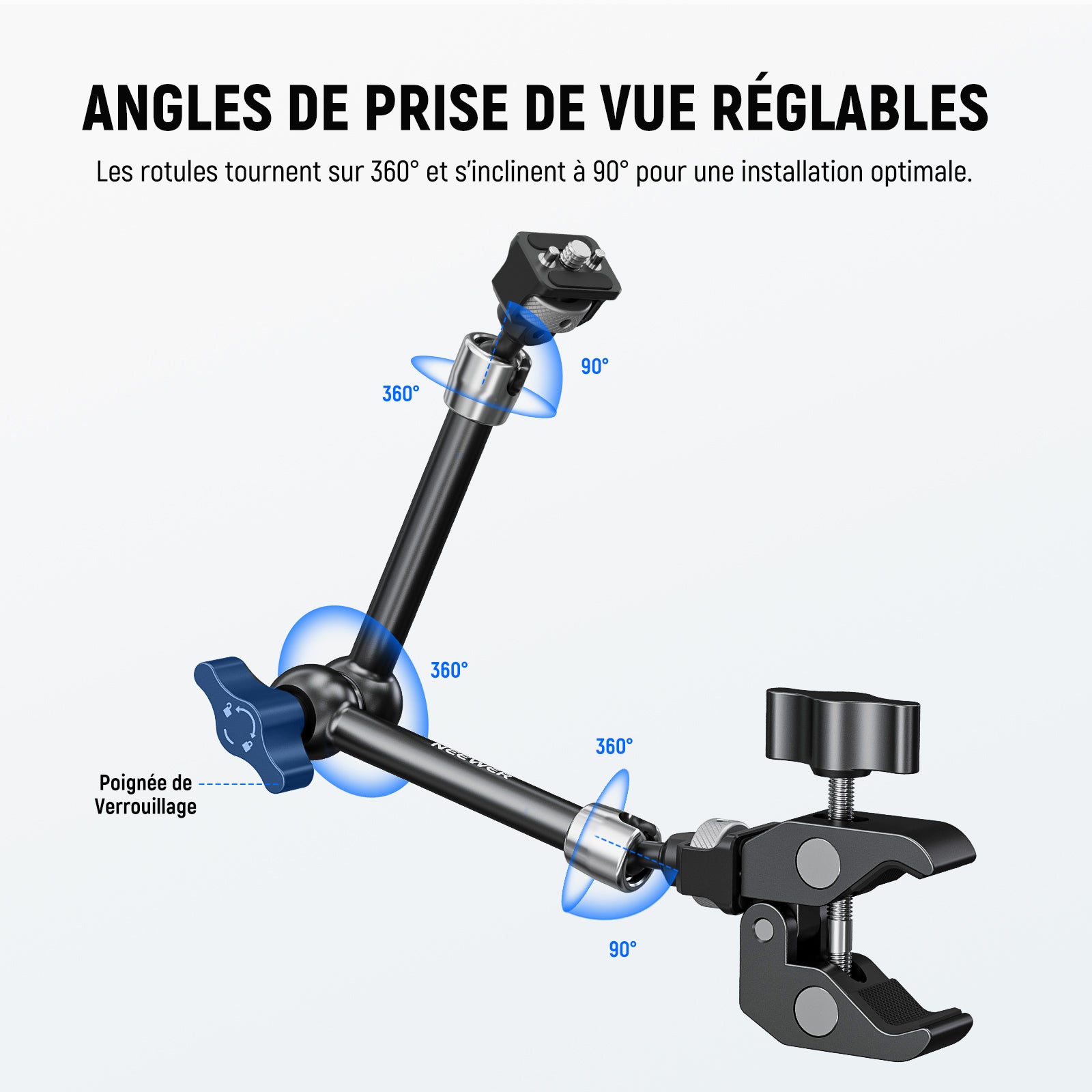 - 【Deux Rotule 360° pour des Angles Variés】 Chaque bras articulé est équipé d'une rotule avec une encoche en U qui tourne sur 360° et s'incline à 90°. Elles peuvent être bloquées à l'angle désiré à l'aide de la grande poignée de serrage, ceci afin d'assurer la stabilité et la précision du positionnement.