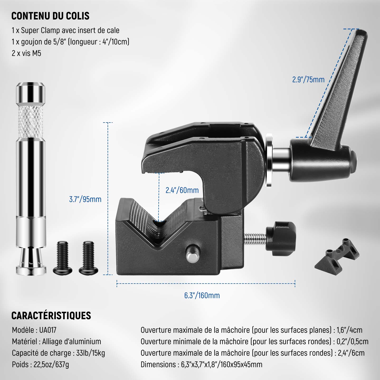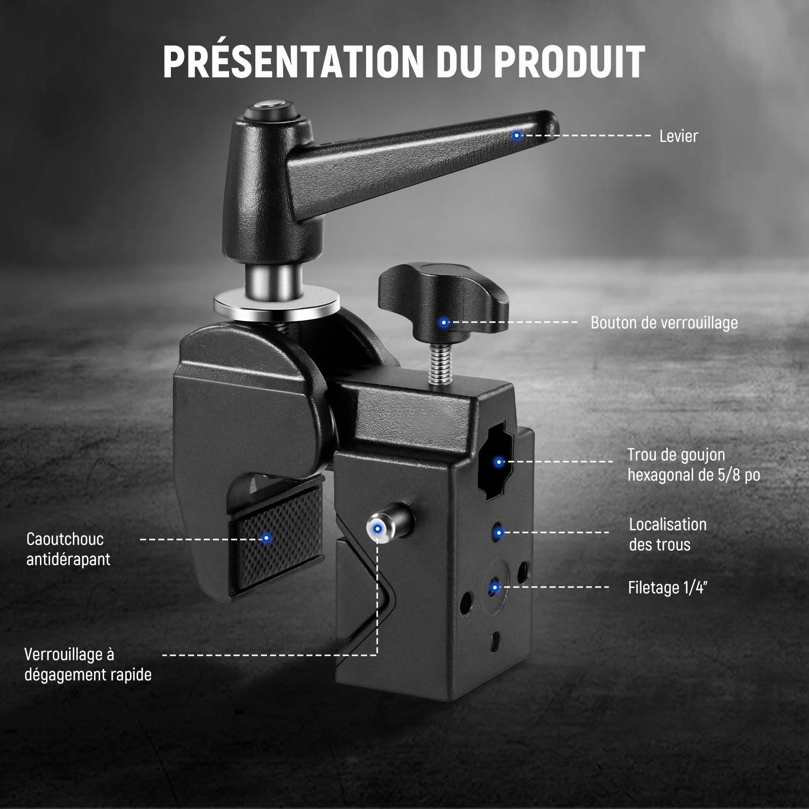 - 【Plus grande et plus solide】Fabriquée en alliage d'aluminium anodisé noir pour une superbe durabilité, cette super pince robuste pèse 22,5oz (637g) et peut supporter des équipements jusqu'à 33lb (15kg). Idéal pour le montage d'appareils photo et d'éclairage et d'autres équipements photographiques