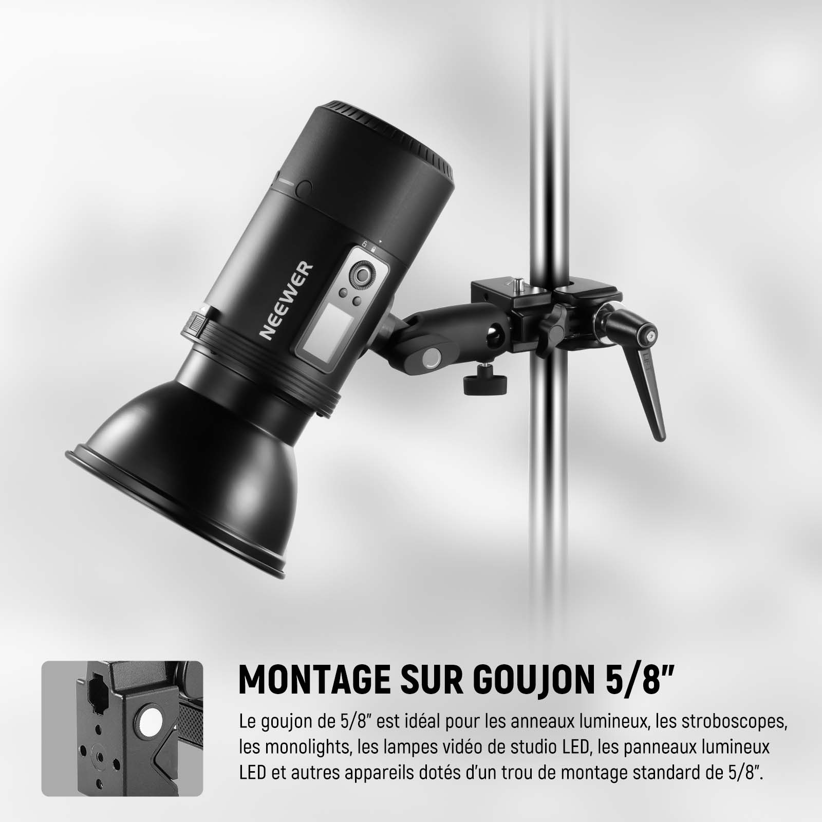 - 【Goujon de 4"/10cm de long de 5/8"】Branchez la pointe hexagonale du goujon de 5/8" dans la super pince tout en appuyant sur le verrou à ressort à dégagement rapide pour un montage pratique mais stable. Le goujon de 5/8" est idéal pour les anneaux. lumières, stroboscopes, monolights, lumières vidéo de studio LED, panneaux lumineux LED et autres appareils avec le récepteur 5/8"