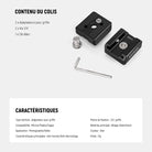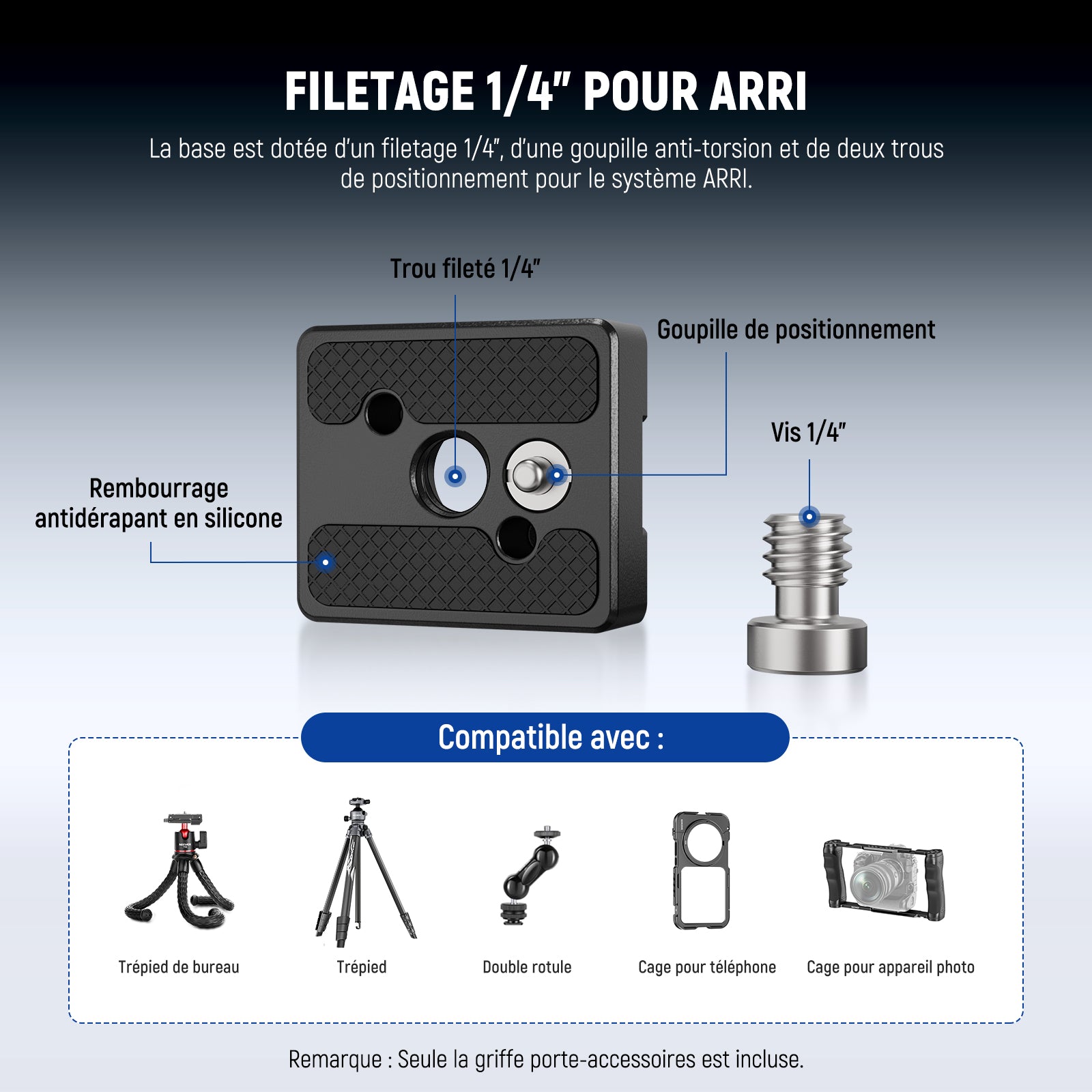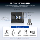 - Trou de filetage de 6,35 mm pour ARRI : la base dispose d'un filetage de 6,35 mm, d'une goupille anti-torsion et de deux trous de localisation pour le système ARRI, permettant une fixation sûre aux cages de l'appareil photo, aux plaques de montage d'accessoires (plaques à fromage), aux bras magiques et aux trépieds. Une vis amovible de 6,35 mm et une clé hexagonale sont incluses pour une installation sans effort