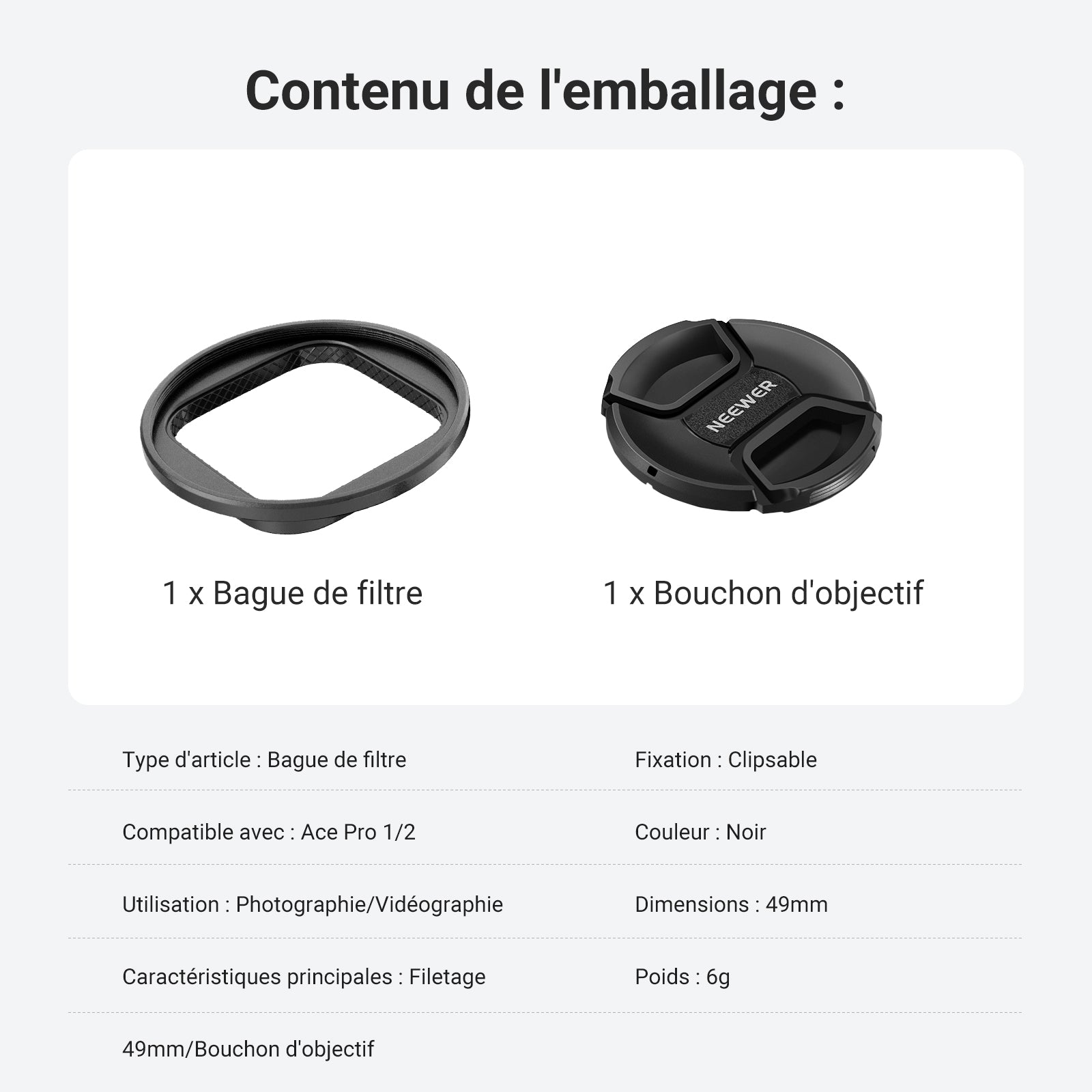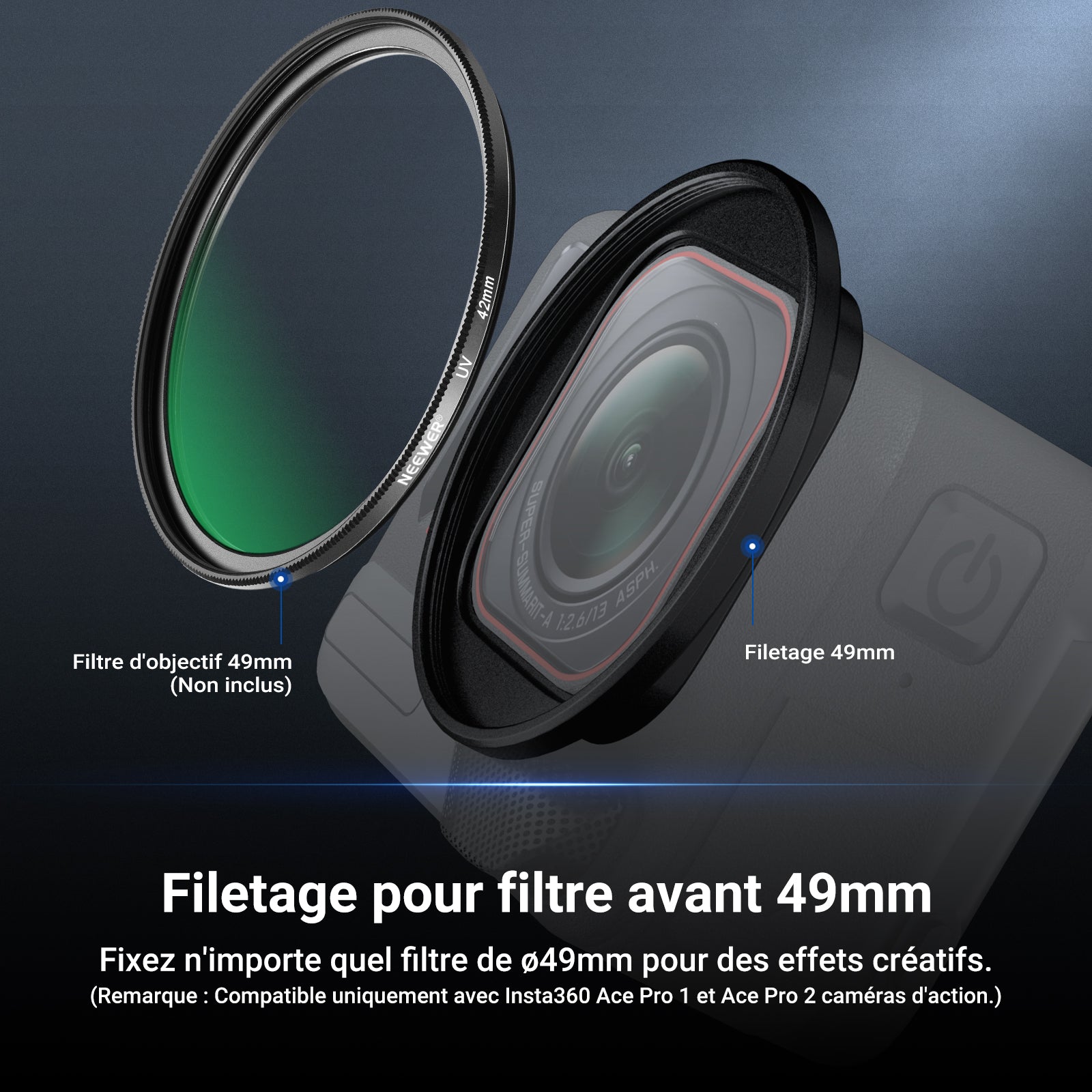 - 【Pour Ace Pro 1 / Ace Pro 2】 Compatible avec Insta360 Ace Pro 1 et Insta360 Ace Pro 2 caméras d'action. Cette bague d'adaptation pour filtre d'objectif de 49 mm n'interfère pas avec les fonctions de la caméra ni avec l'utilisation d'accessoires photo