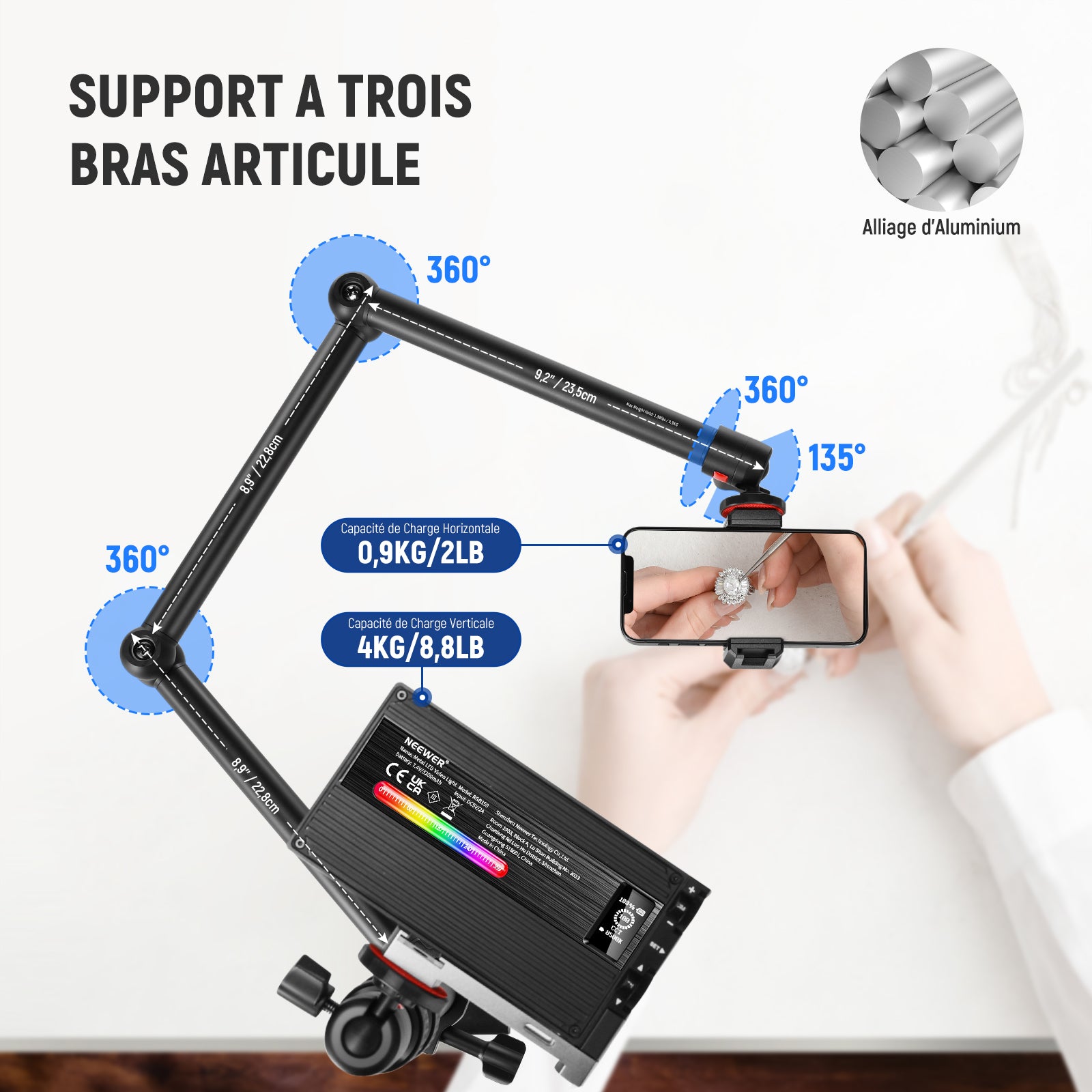 - 【Support pour bureau amélioré】Ce support NEEWER TL253A+MH022 qui est montable sur une table ou un bureau est équipé d'une perche droite réglable en hauteur, d'un bras de maintien pliable en 3 sections, d'un support pour téléphone, ainsi que des vis standard de 1/4" intégrées aux têtes verticales et horizontales pour tenir un appareil photo, un téléphone, une lumière LED, une webcam, et bien plus encore. Cet ensemble est parfaitement adapté pour l'enregistrement vidéo et la diffusion en direct