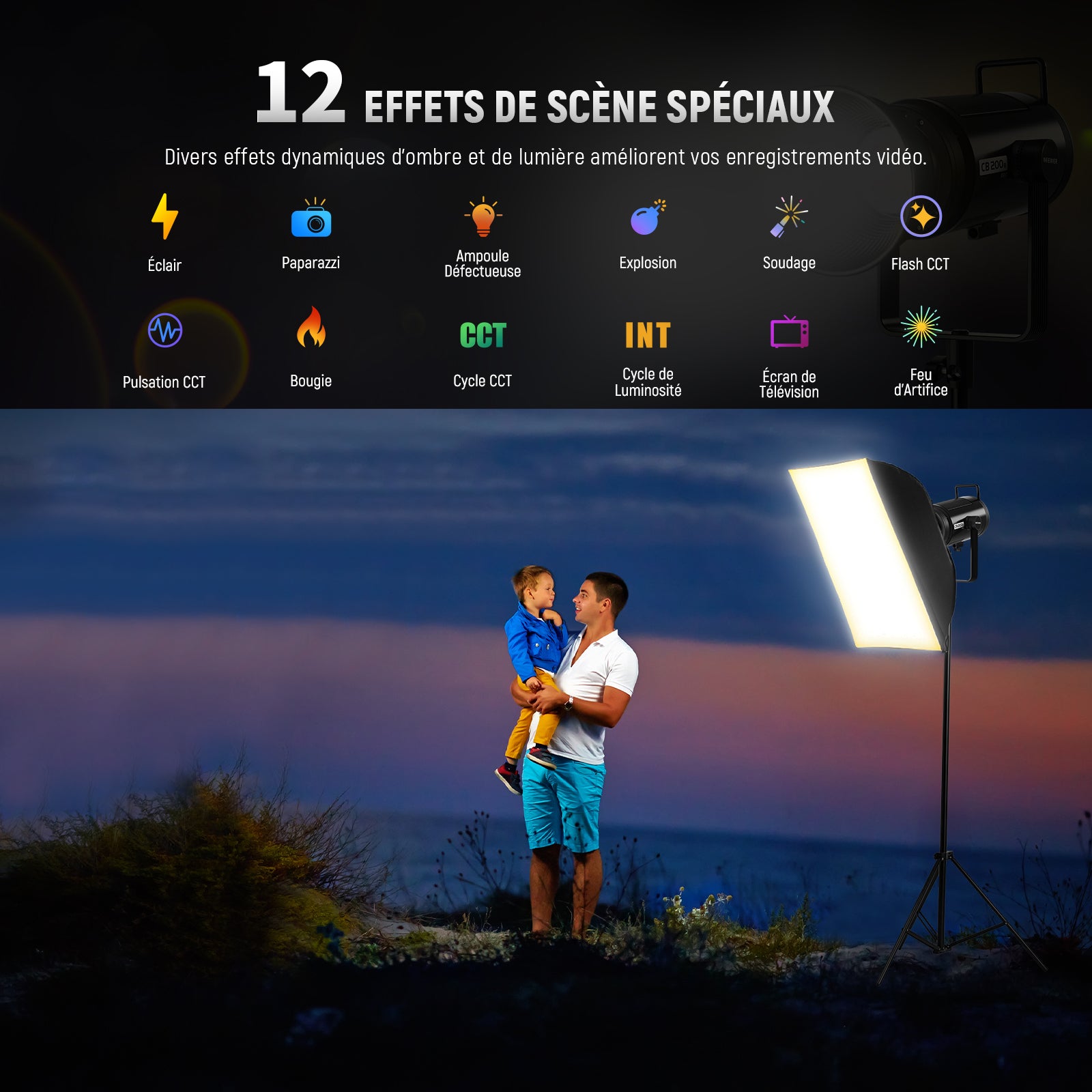 - 【12 Effets de Scène/Silence/Mode Booster】 12 effets de scène préprogrammés pour ajouter des éléments accrocheurs à votre vidéo. Supporte le mode Booster avec un seul bouton, qui peut fournir une puissance d'environ 210W et 90000Lux/1m, le ventilateur est activé automatiquement pour dissiper la chaleur. Le mode silencieux fournit une puissance d'environ 60W et 30000Lux/1m, dans ce mode le ventilateur reste éteint, il convient à pour éclairer des prises de vue avec des enfants/des animaux