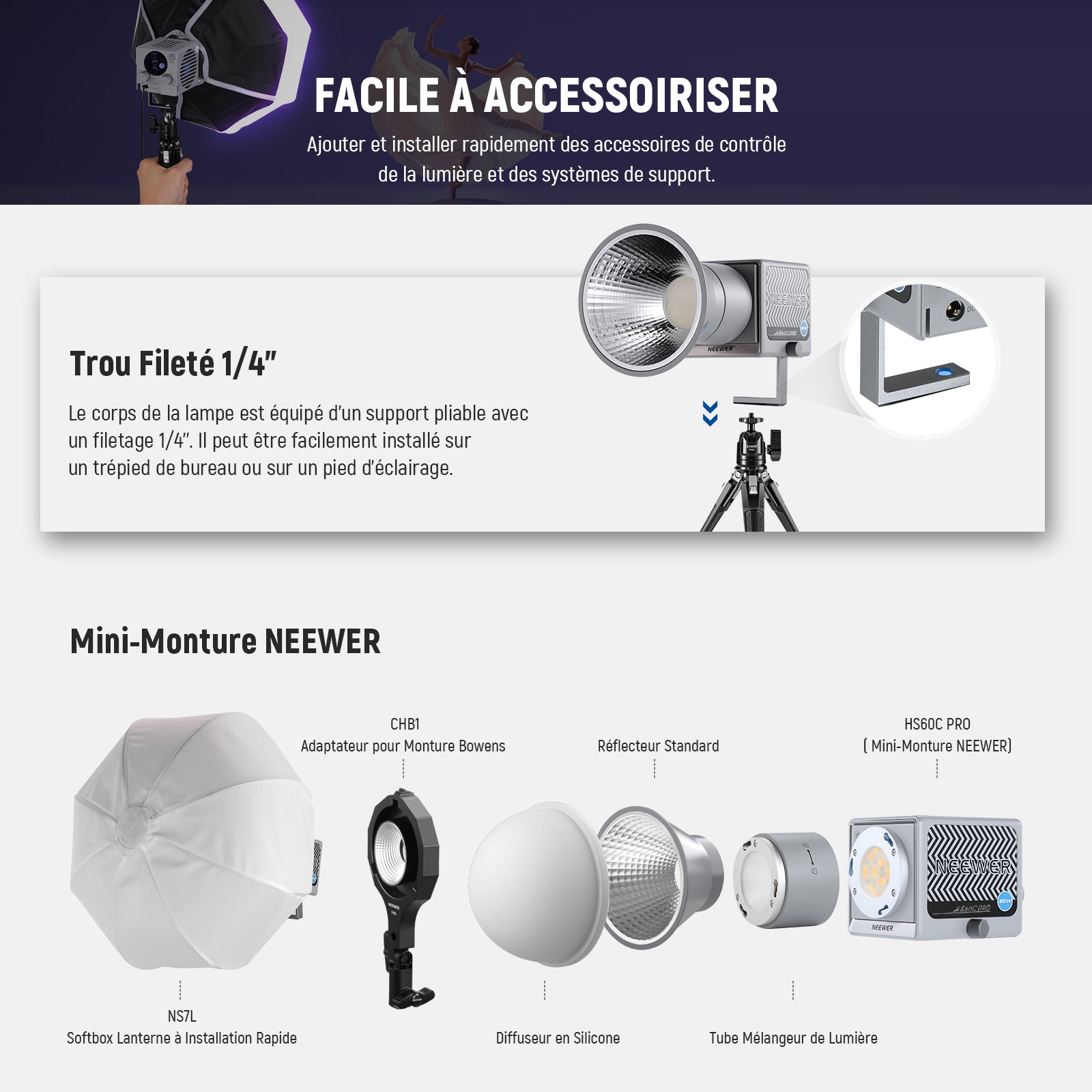 - 【Mini Éclairage Vidéo COB Portable】Le NEEWER HS60C Pro est un éclairage photographique portable qu’on peut tenir dans la paume de votre main grâce à ces dimensions compactes de 95 x 68 x 68 mm et son poids de 315g.L’appareil fournit un éclairage uniforme et lumineux ainsi que des couleurs RGB, kit de lumière principale/lumière de remplissage douce,pour des créations personnelles ou professionnelles. Indispensable pour l'enregistrement vidéo,LIVES, vlogging,mariages,podcasts,interviews