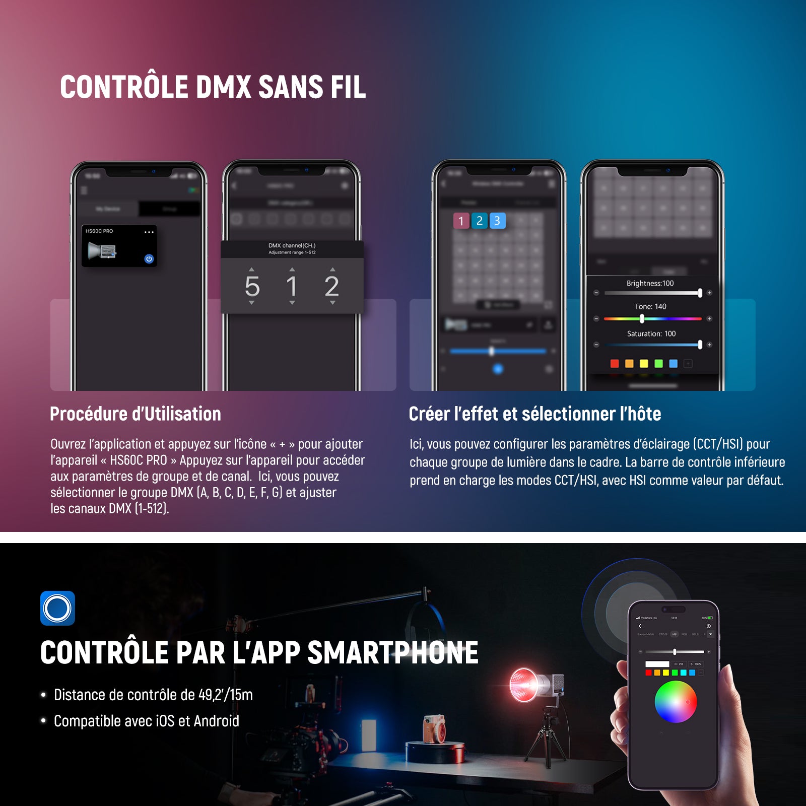 - 【Contrôle via Application, DMX ou Direct】 Téléchargez l'application NEEWER pour contrôler jusqu'à 8 lumières (rayon de 15m via Bluetooth), ajuster les paramètres et activer les mises à jour OTA. Débloquez des configurations d'éclairage avancées via l'interface DMX dans l'application, telles que la programmation personnalisée des effets lumineux, le stockage et le contrôle de plusieurs groupes d’éclairages. Les paramètres de base sont réglables via le panneau de contrôle.