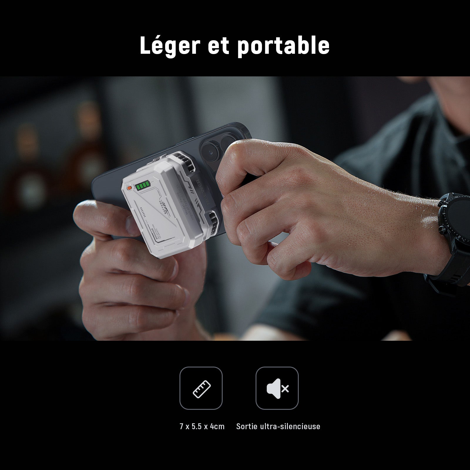 - Léger et portable : le ventilateur de téléphone pour jeu mesure 7 x 5,5 x 4 cm et ne pèse que 160 g, ce qui le rend extrêmement portable. La taille compacte du refroidisseur de téléphone le rend facile à ranger dans des sacs ou des poches, ce qui vous garantit de pouvoir l'emmener partout comme accessoire essentiel pour les créateurs de contenu et les influenceurs.