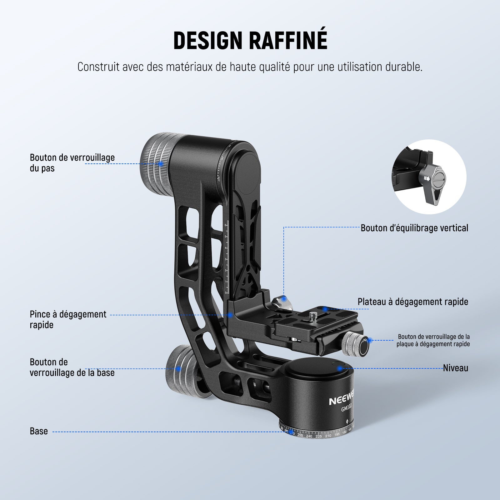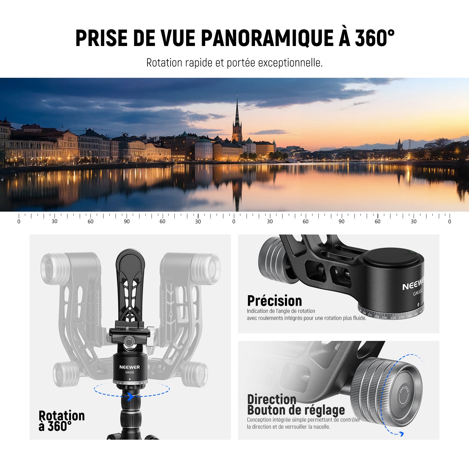 - 【Réglage à Trois Axes】 Avec une base panoramique à 360°, un bras pivotant et le design exclusif à dégagement rapide, la tête gimbal permet une rotation horizontale et verticale à 360°, et un réglage vers le haut et vers le bas, le tout sécurisé par les boutons de serrage à la main. Un niveau à bulle intégré permet de vérifier d'un coup d'œil que l'installation est de niveau. Remarque : Soutenez votre appareil d'une main lorsque vous réglez les boutons pour éviter les chutes accidentelles