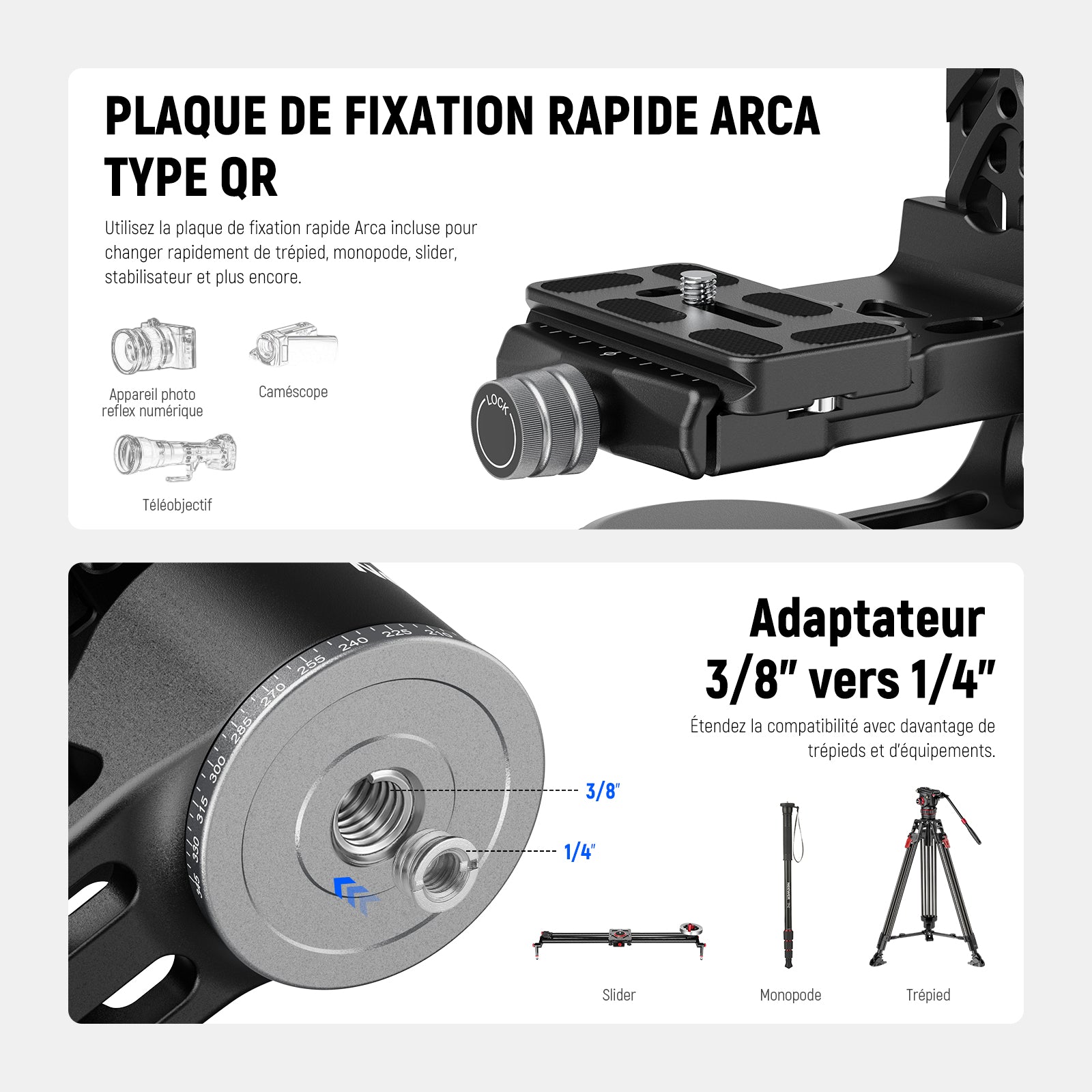 - 【Plaque QR de Type Arca à Dégagement Rapide】 Adieu le changement d'appareil encombrant. Utilisez la plaque QR de type Arca incluse pour des échanges rapides entre trépieds, monopodes, curseurs, stabilisateurs, et même les montages à clip de sangle de sac à dos avec des systèmes de montage identiques. Le bouton latéral assure un verrouillage sûr et serré, vous offrant une tranquillité d'esprit pendant vos séances de photographie