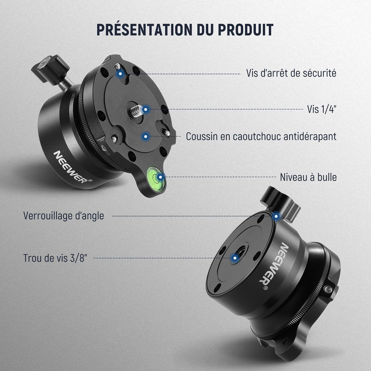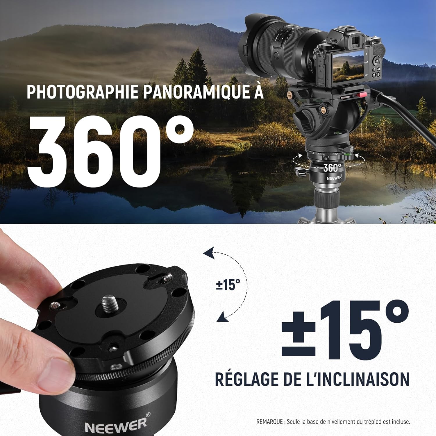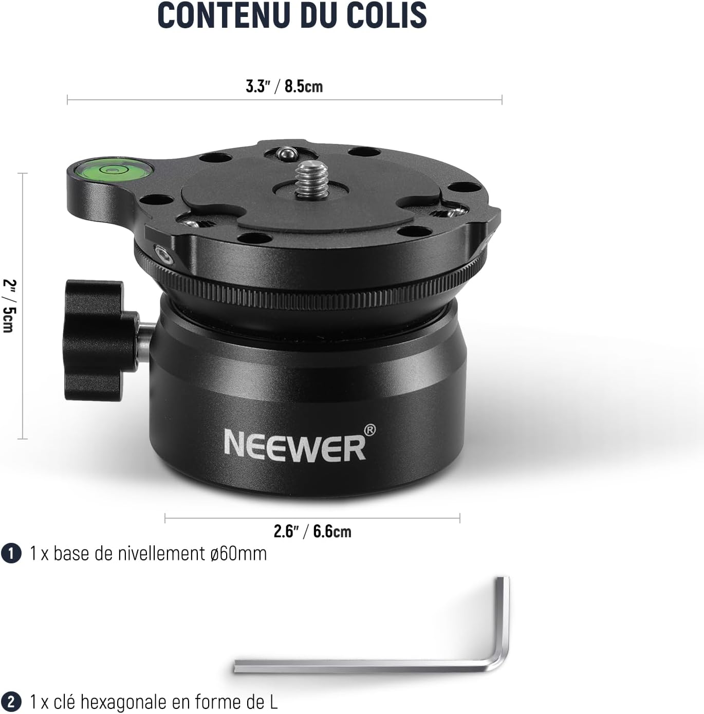 - 【Adaptateur à vis 1/4" à 3/8"】Avec un adaptateur fileté 1/4" à 3/8", la base de nivellement de la tête de trépied de 60mm de diamètre peut fonctionner avec une large gamme de trépieds, monopodes et curseurs d'appareil photo. Un tournevis est inclus