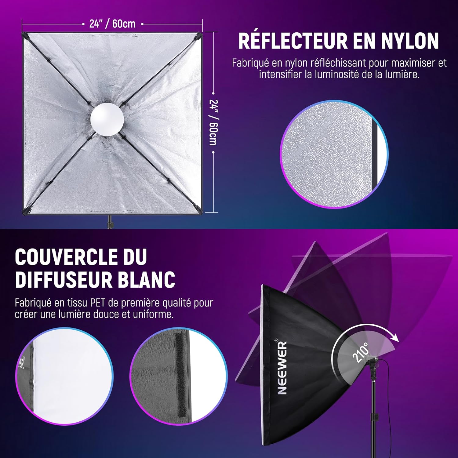 - 【Softboxes carrées durables de 61 x 61cm】Les Softboxes en nylon durable présentent des intérieurs argentés pour une véritable couleur de lumière et des diffuseurs blancs pour une sortie large et uniformément répartie. La douille en porcelaine E27 intégrée s'adapte à une large gamme d'autres ampoules LED, incandescentes et fluorescentes (non incluses)