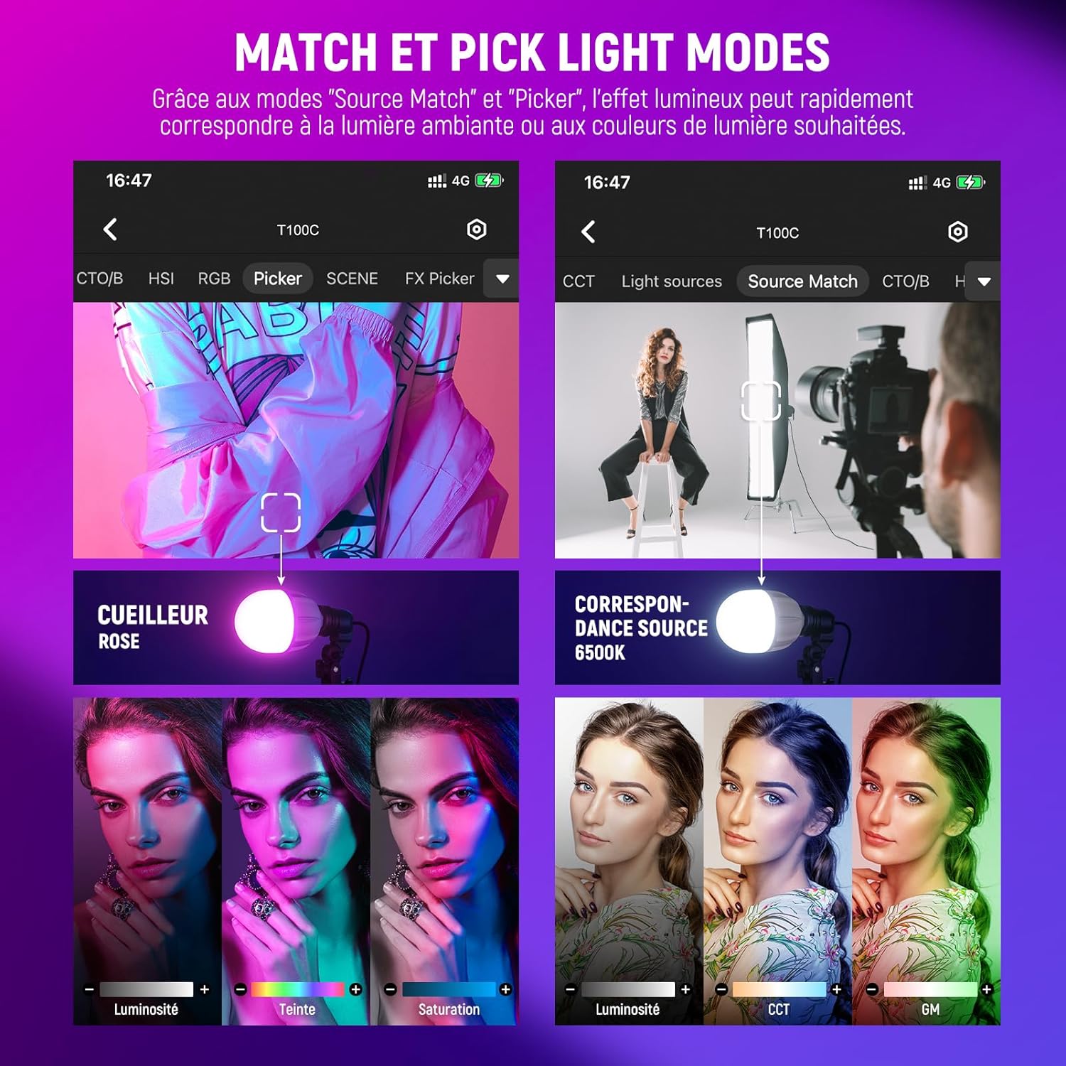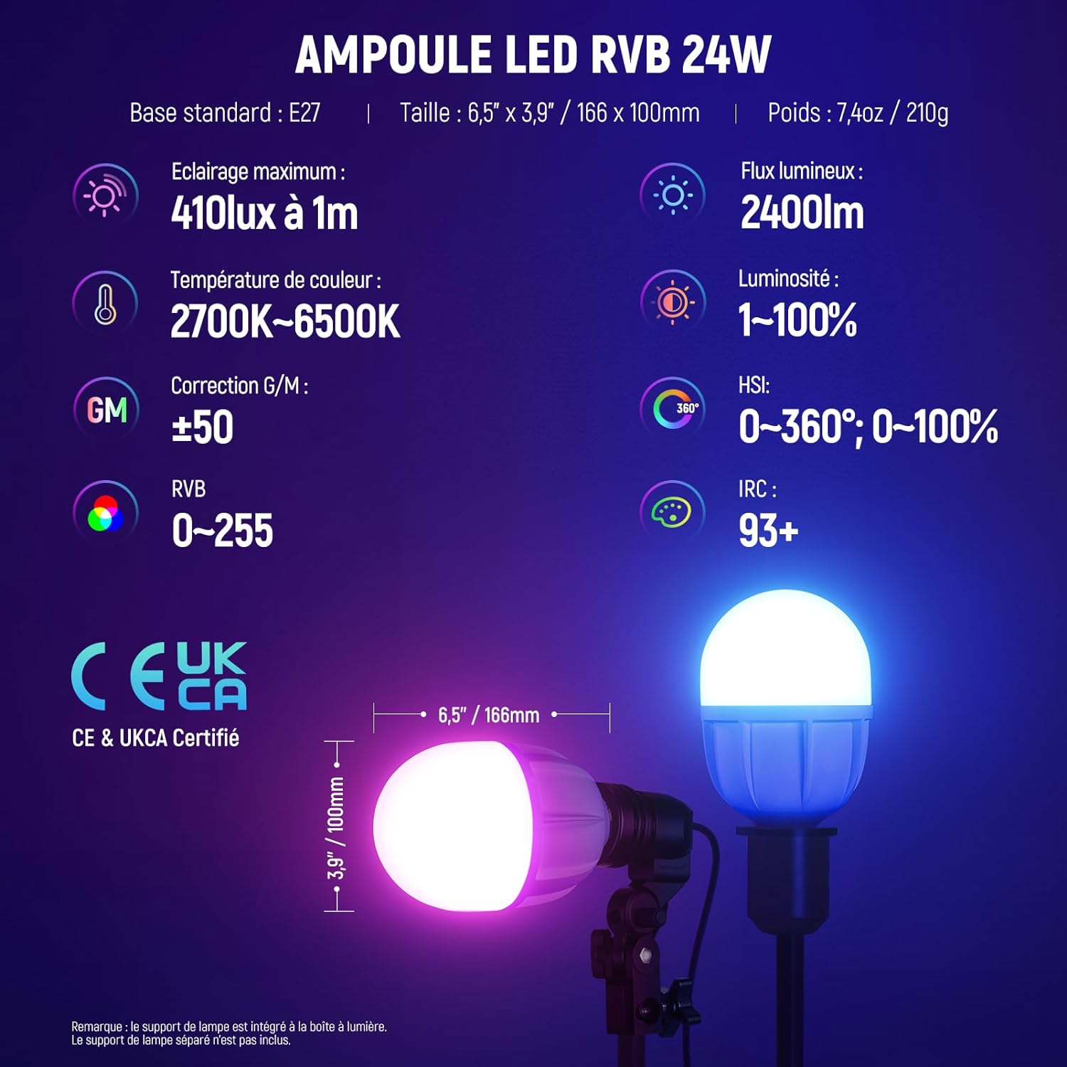 - 【Les ampoules LED RVB de qualité supérieure】Les ampoules certifiées FCC/IC/CE&UKCA avec LED RVB intégrées offrent une puissance de 24W, un éclairement maximal de 400lux/m, une gradation de 0 à 100%, 36000 couleurs pour la photographie et les vidéos créatives, une température de couleur de 2700K-6500K pour les flux en direct et l'éclairage de la photographie en studio, et CRI93+/TLCI98+ pour des performances de couleur précises