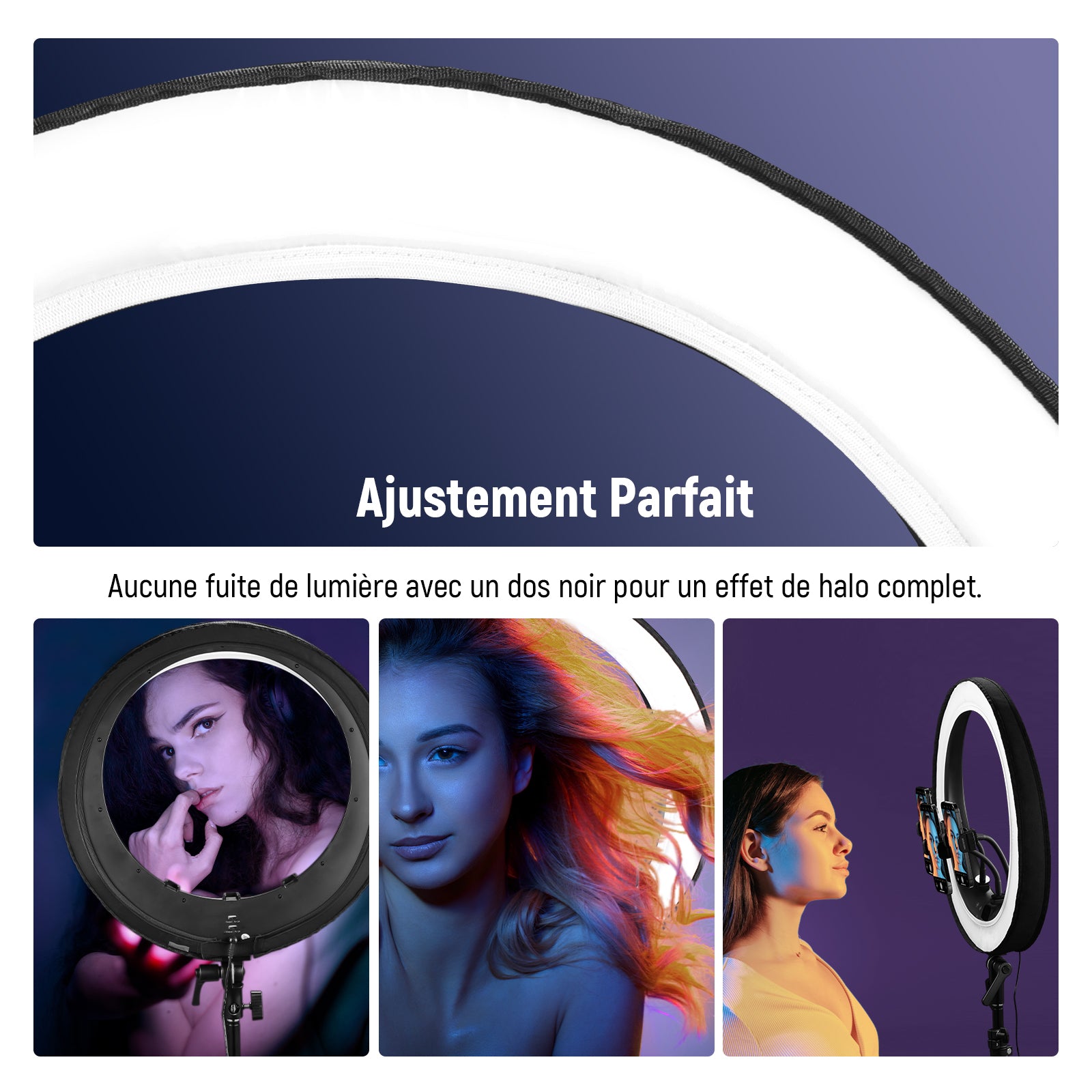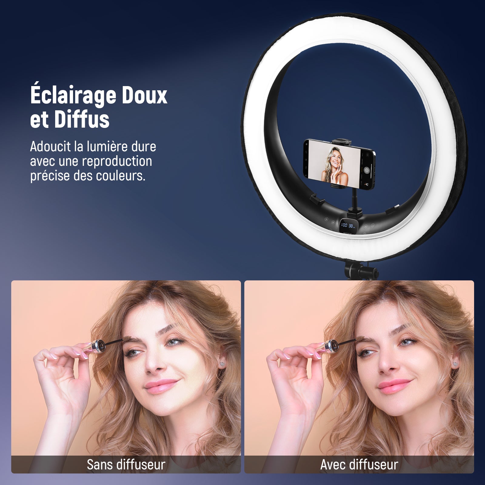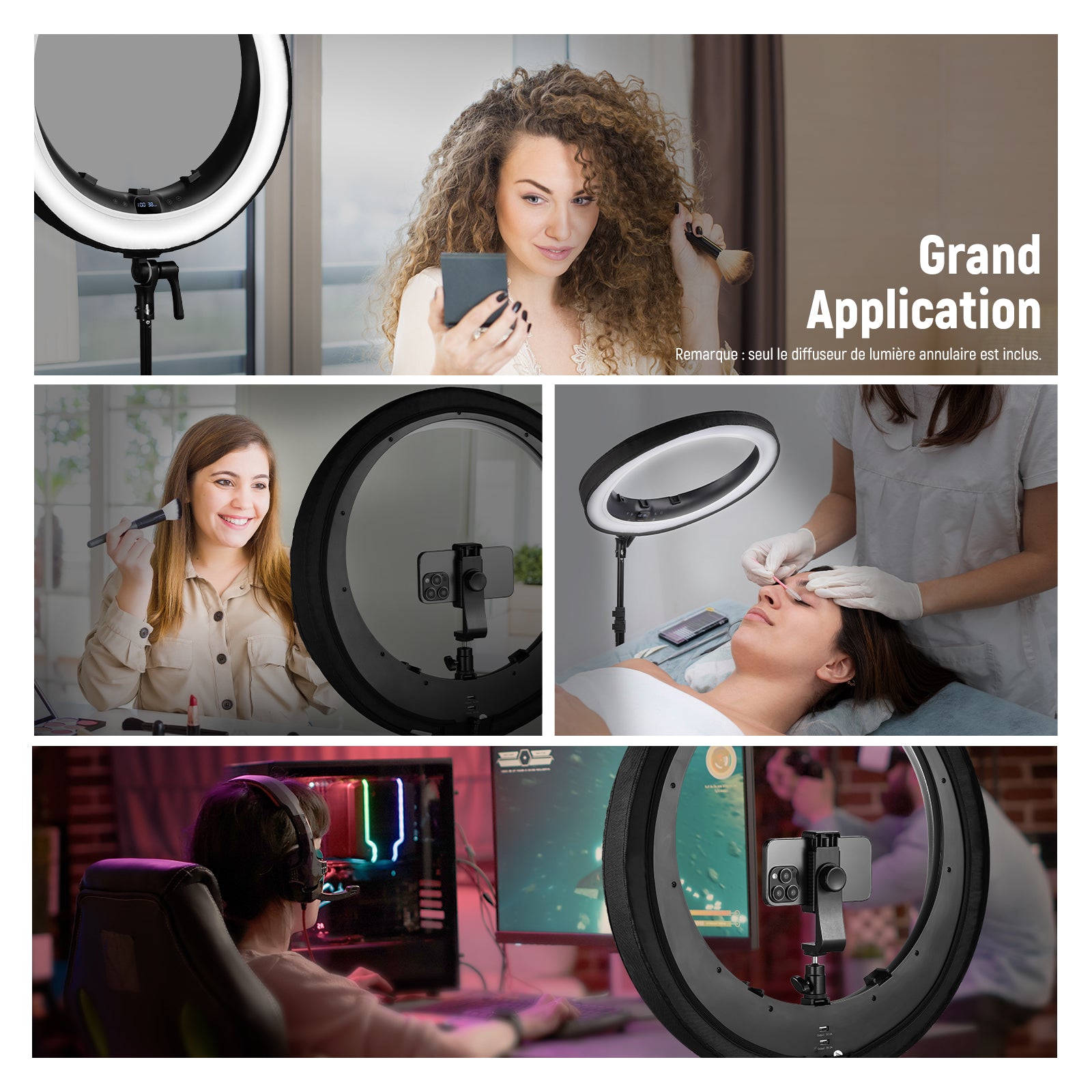 - 【Éclairage Doux et Diffus】en forme de plat de beauté avec une coque arrière professionnelle, conçu pour éviter toute fuite de lumière, et fonctionne comme les portes de grange lumineuses à LED pour créer un anneau lumineux avec un bord plus net. Ce diffuseur vous offre un éclairage doux et uniforme et une forme de lumière circulaire pour le maquillage, les selfies, les diffusions en direct et les appels Zoom.