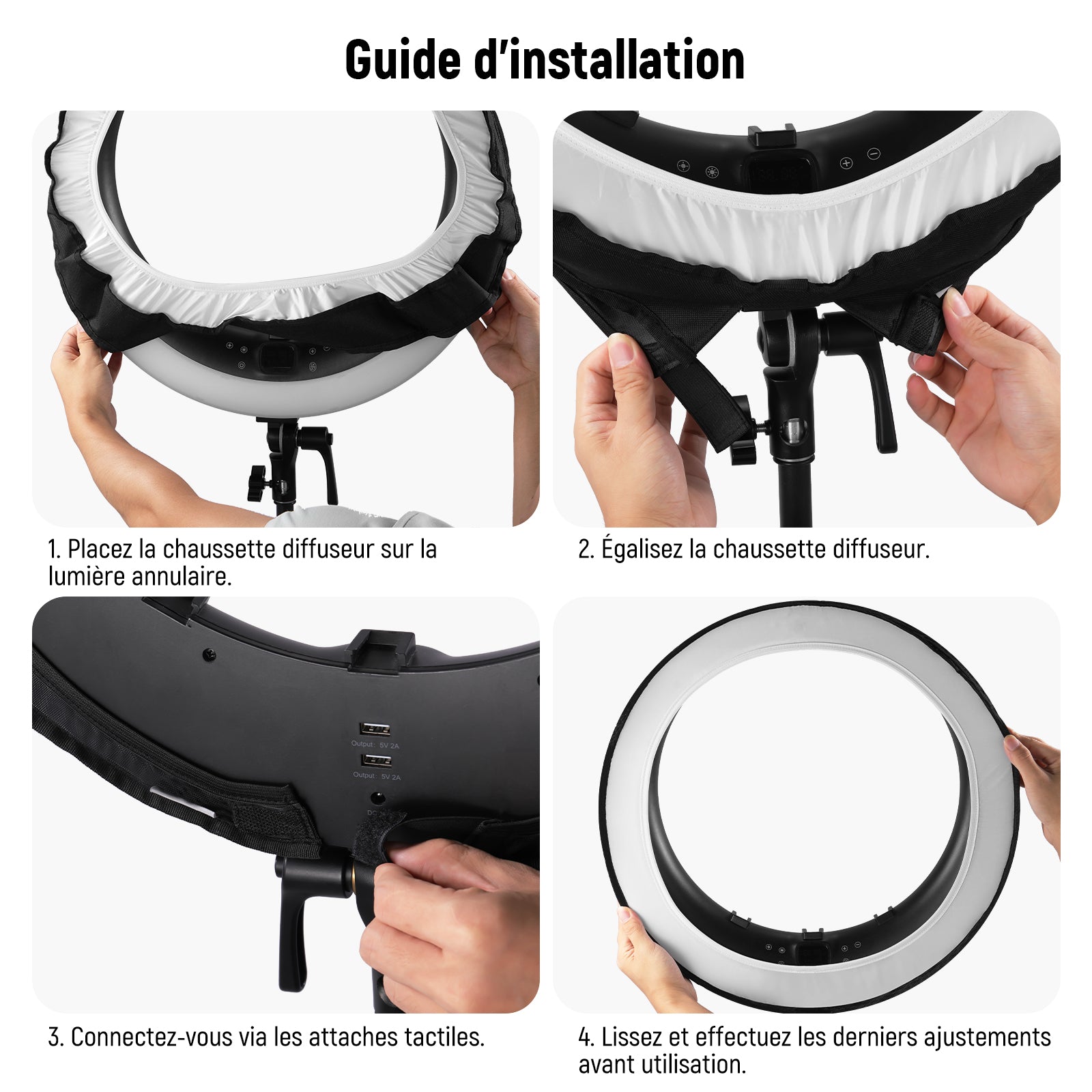 - 【Installation Sans Effort】La chaussette diffuseur avec bords élastiques peut facilement couvrir la lumière LED sans affecter les fonctions du panneau tactile sur les anneaux lumineux RP18H/RP19H. Les attaches tactiles vous aident à sécuriser le diffuseur et à éviter les fuites de lumière