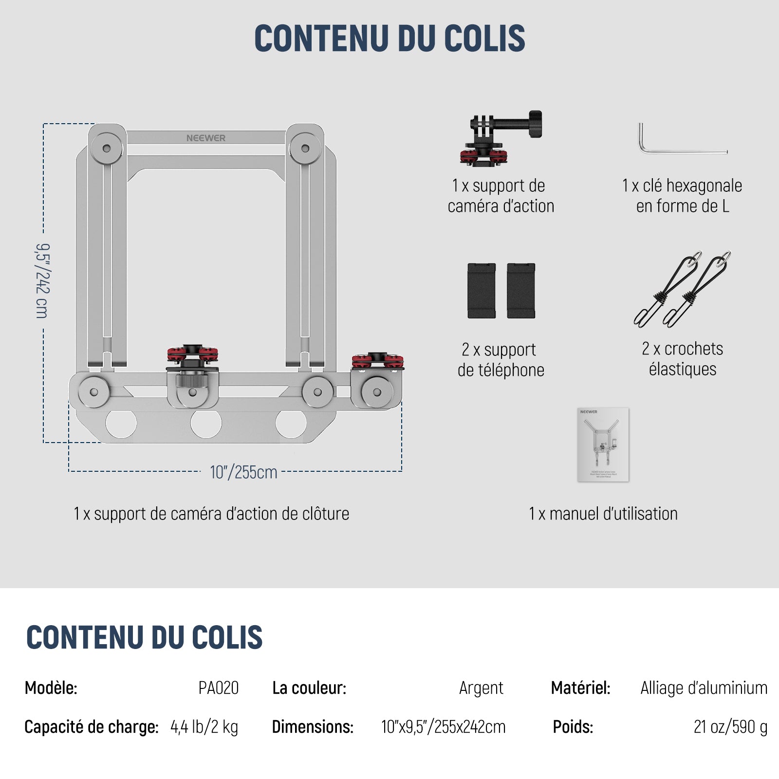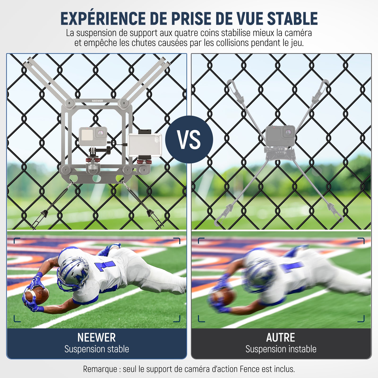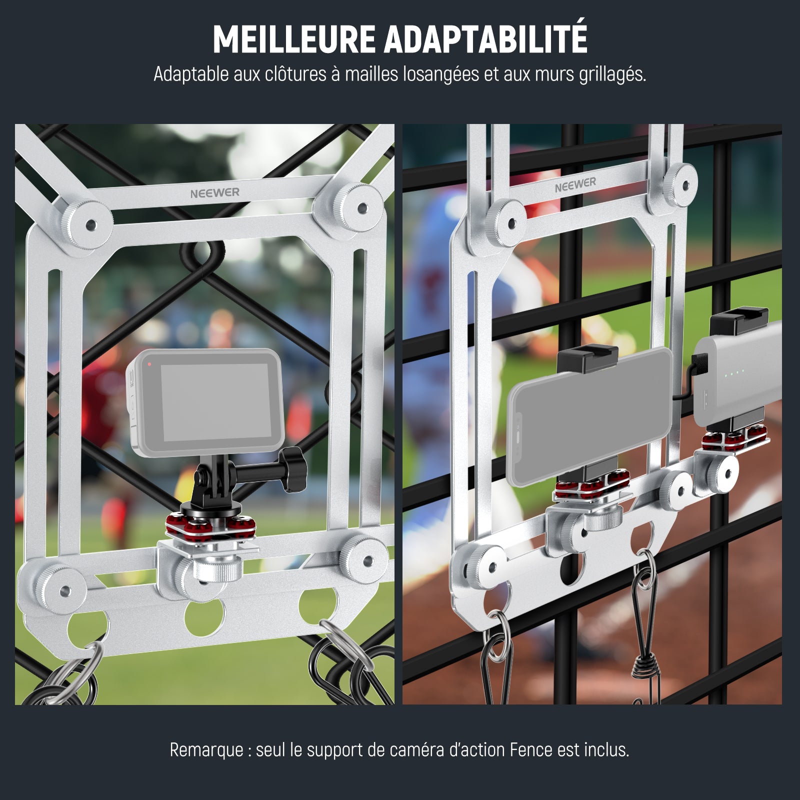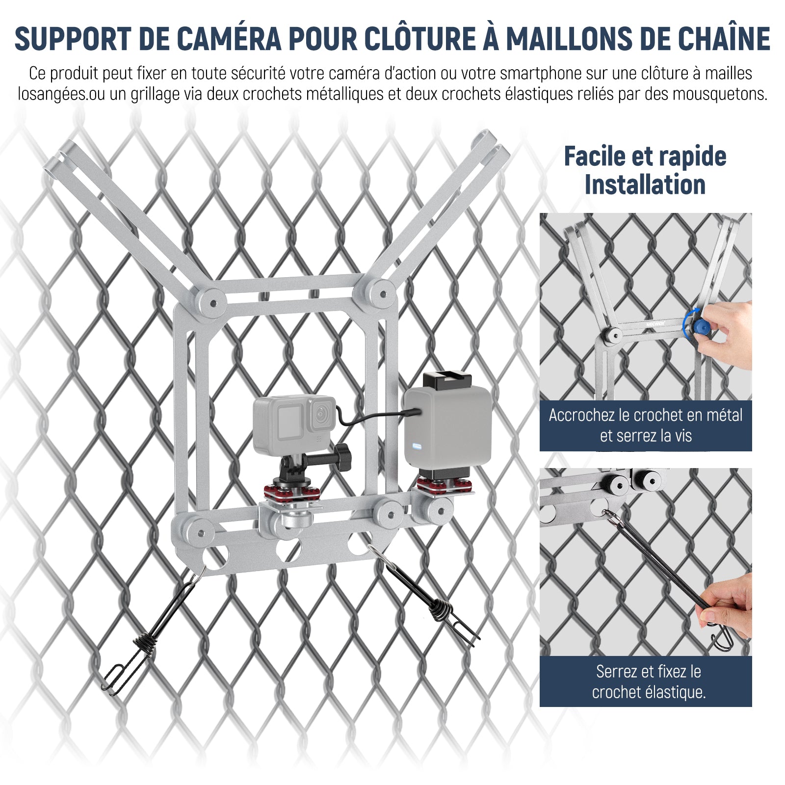 - Support de caméra pour clôture à maillons de chaîne- ce produit peut monter en toute sécurité votre caméra d'action ou votre smartphone sur une clôture à mailles de chaîne ou un mur grillagé via deux crochets métalliques et deux crochets élastiques reliés par des mousquetons. Parfait pour enregistrer des séquences de baseball, de basket-ball, de football, de softball, de tennis et d'autres sports