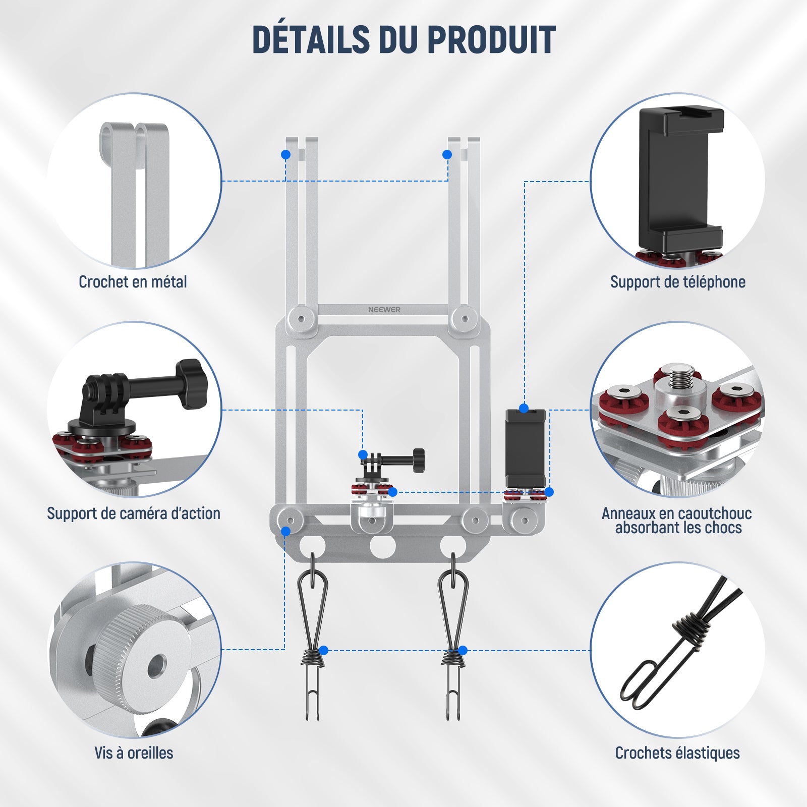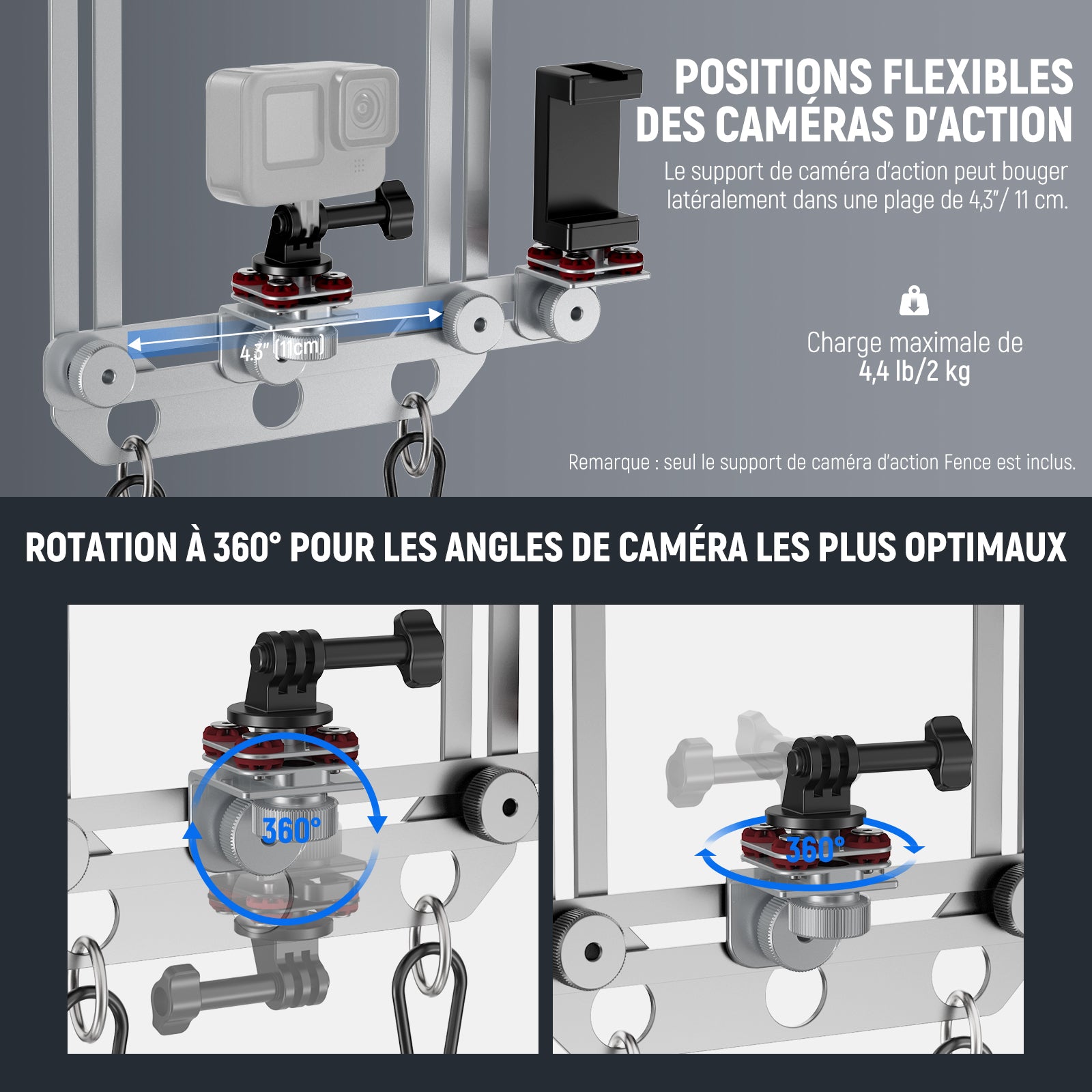 - Positions flexibles de la caméra d'action - le support de caméra d'action peut se déplacer latéralement dans une plage de 4,3" (11 cm) et pivoter à 360° pour les angles de caméra les plus optimaux. La vis moletée vous permet de serrer le support de caméra d'action à la main. Quatre chocs. les anneaux en caoutchouc absorbants peuvent réduire les vibrations et vous aider à prendre des vidéos stables