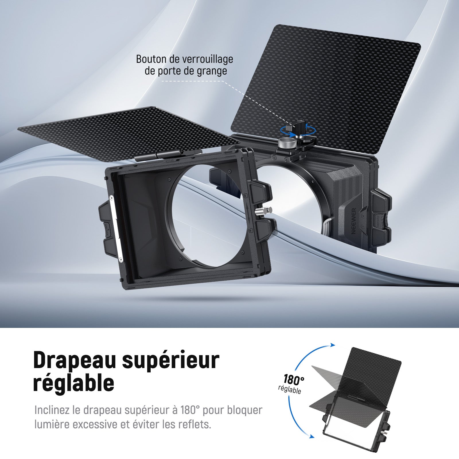 - 【Drapeau Inclinable à 180° avec Tissage en fibre de carbone "uni"】inclinez le drapeau supérieur à 180° pour bloquer la lumière excessive et éviter les reflets. Rabattez le drapeau pour couvrir le filtre avant et protéger l'objectif. Le verrou supérieur du drapeau maintient fermement le drapeau en place. Et la vis moletée vous permet d'ajuster le drapeau d'avant en arrière pour accueillir 1 ou 2 plateaux filtrants pour un blocage parfait de la lumière.