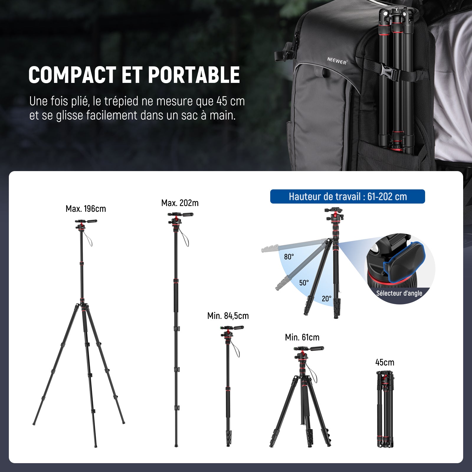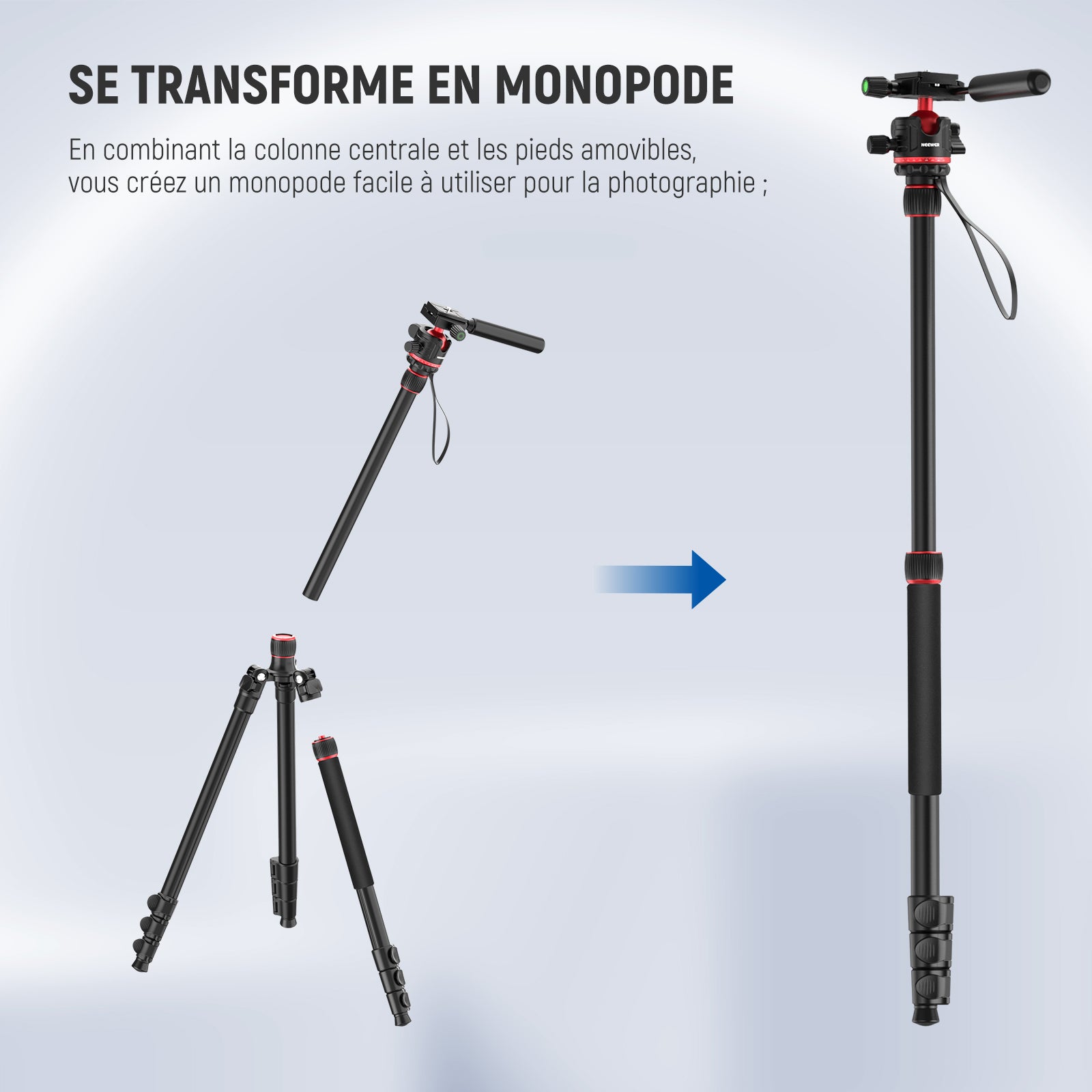 - 【Trépied et monopode 2 en 1】 Passez facilement du trépied au monopode ! Détachez simplement un pied du trépied et fixez-le à la colonne centrale. Idéal pour les prises de vue professionnelles et stables, les photos à longue exposition avec le trépied et les situations rapides et mobiles avec le monopode. De plus, le monopode peut également être utilisé comme bâton de randonnée pendant vos randonnées !