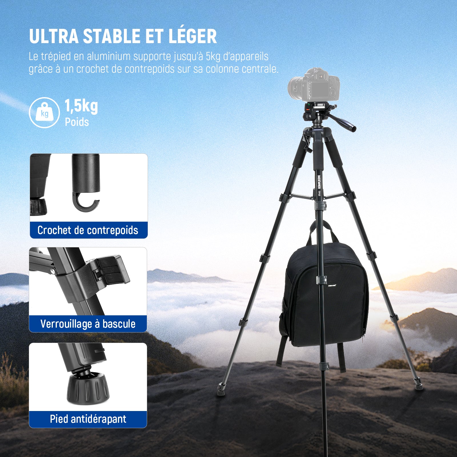 - Super stable mais léger : fabriqué en alliage d'aluminium et en plastique, le trépied d'appareil photo très résistant prend en charge les appareils photo reflex numériques (compatible avec les appareils photo Sony Nikon Canon) avec un poids allant jusqu'à 5 kg. Ses pieds pivotants à 360° et ses coussinets en caoutchouc antidérapants assurent une excellente adhérence sur différentes surfaces, tandis qu'un crochet de contrepoids sur la colonne centrale assure une sécurité supplémentaire. Avec un poids de seulement 1,5 kg