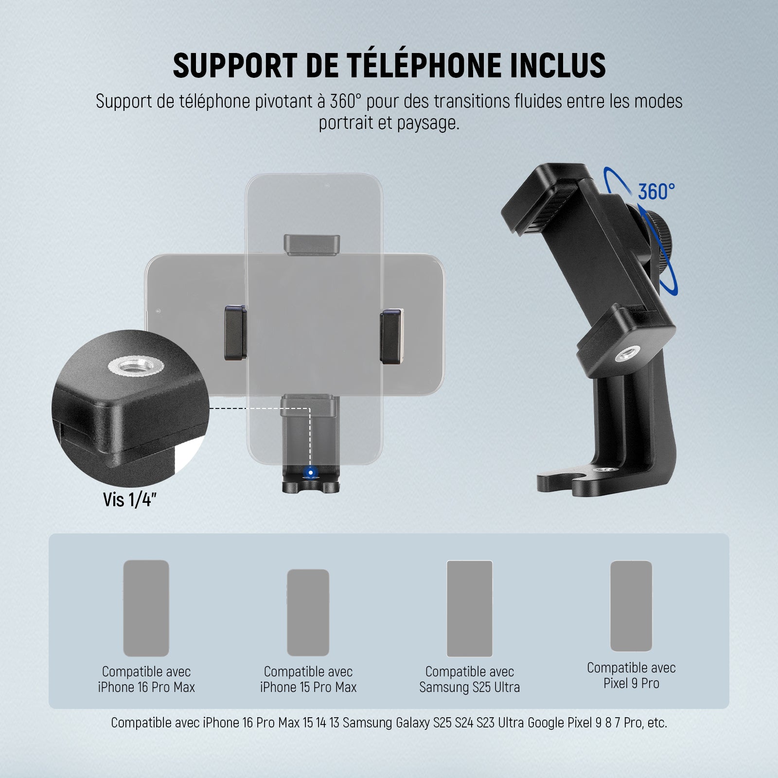 - Fermeture rapide et large compatibilité : fixez ou desserrez la plaque à dégagement rapide via un verrou de sécurité (avec une plaque supplémentaire de rechange). La vis 1/4" en haut est adaptée pour les supports de téléphone portable, les adaptateurs de caméra d'action et plus encore. Seul le support de téléphone portable est inclus dans la livraison, de sorte que le trépied photo haut est compatible avec iPhone 16 Pro Max, iPhone 15, Samsung Galaxy S25, S24 Ultra Android, etc. Il dispose d'une griffe de flash pour les flashs éclaircissants ou les micros