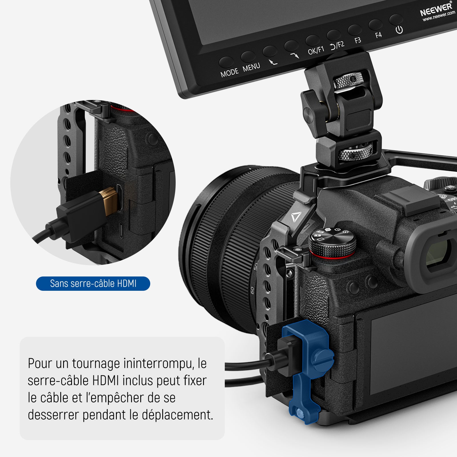 - 【Serre-câble HDMI inclus】 Le serre-câble HDMI réglable s'adapte à des câbles de différentes longueurs et largeurs et empêche tout desserrage ou chute pendant la prise de vue. Ses patins en caoutchouc protègent les câbles des rayures